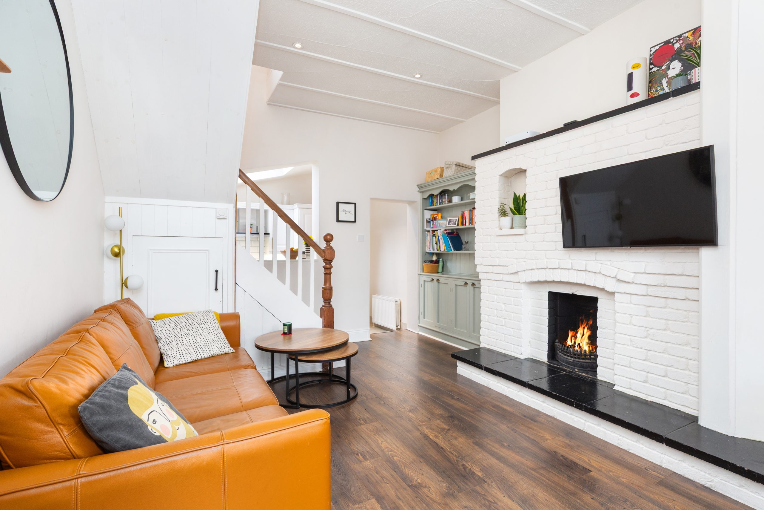 Laminate flooring. Recessed lighting. Fireplace with brick surround. Built-in storage. Under stairs storage.