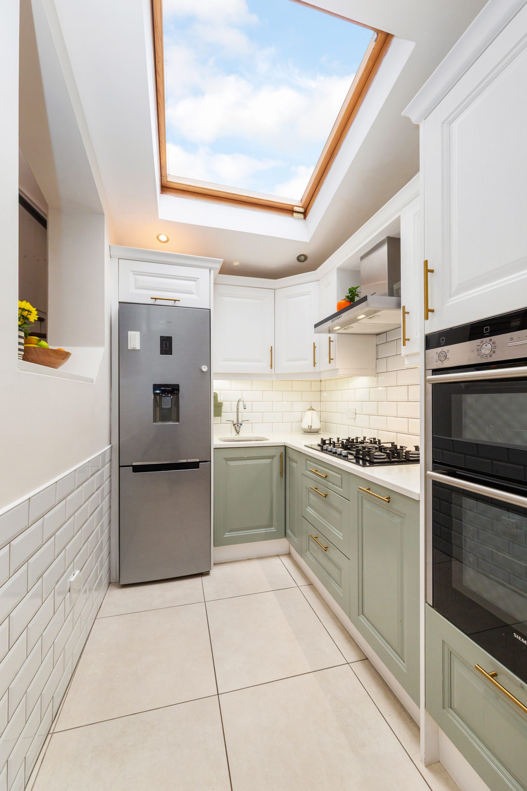 Tiled floor. Recessed lighting. Range of wall and floor units. Integrated double oven, 5 ring gas hob, extractor fan and dishwasher. Tiled splashback. Velux window. Gas boiler.