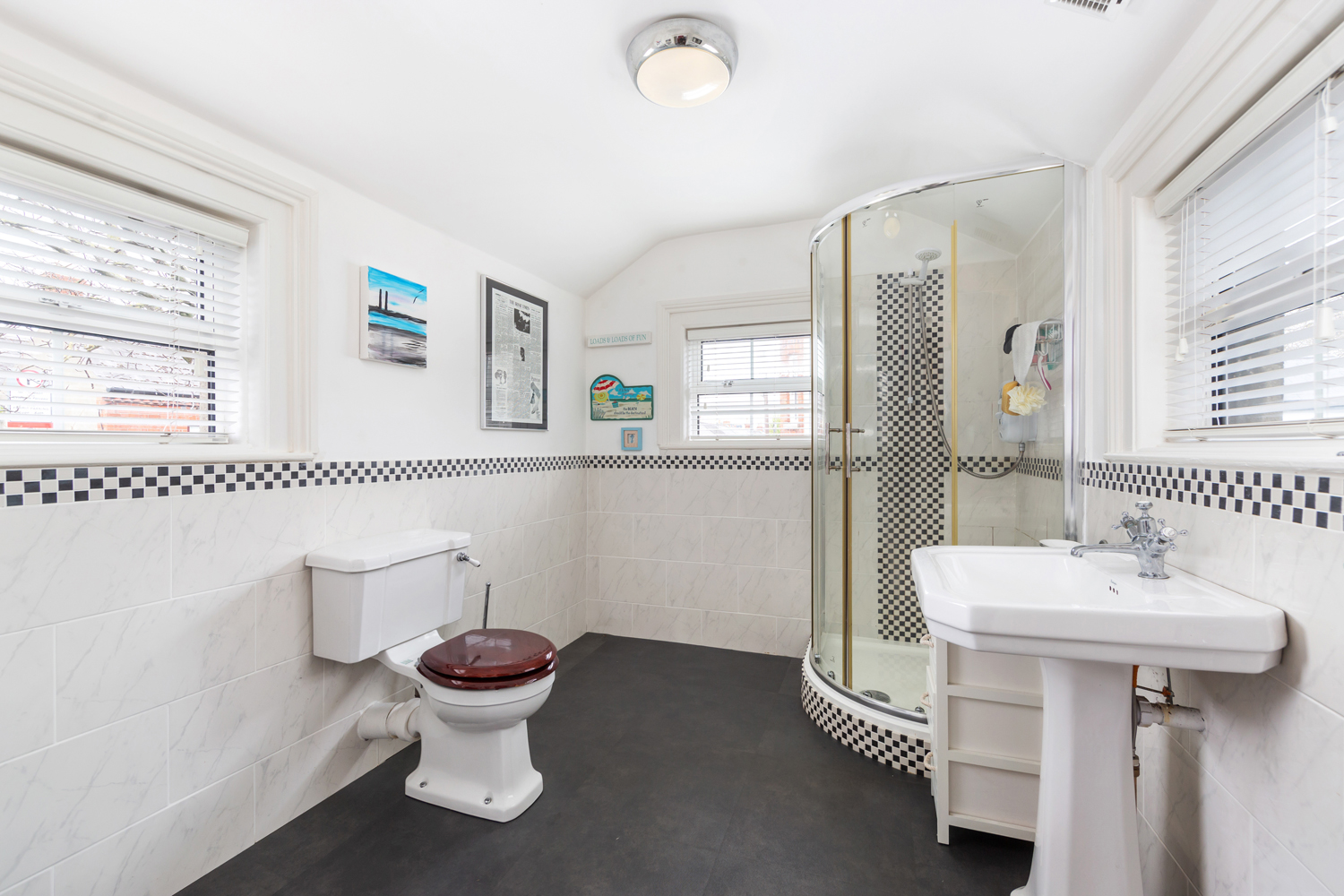 Part tiled walls. Pedestal wash hand basin. WC. Shower enclosure with Triton shower. Extractor fan. Vaulted Ceiling. Heated towel rail.