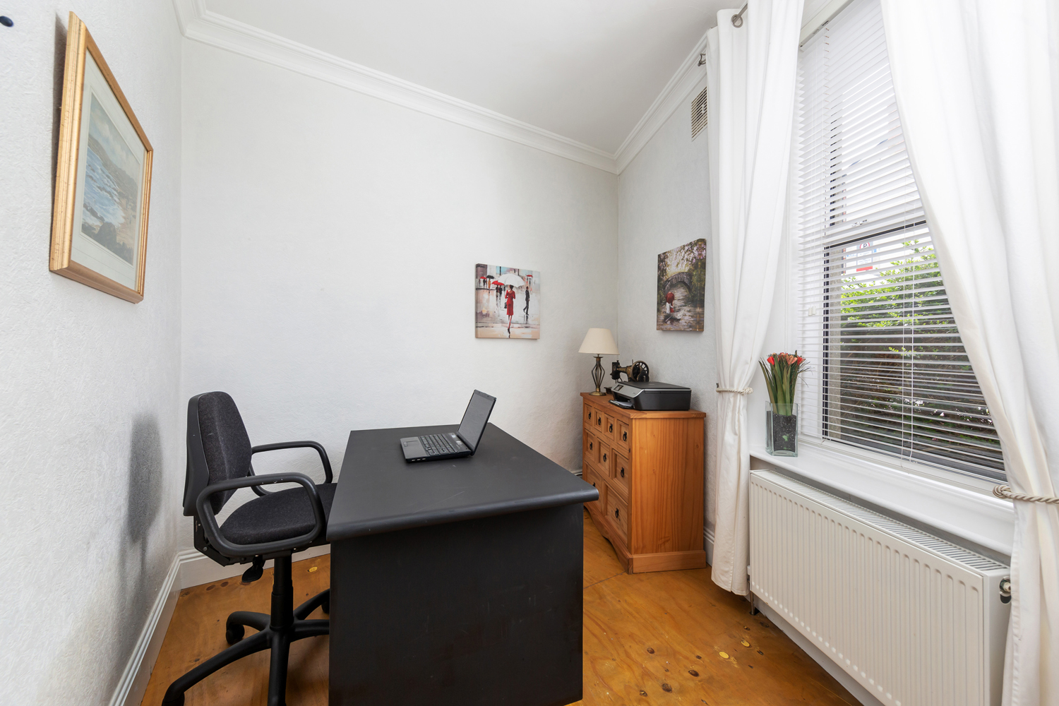 The upstairs entrance leads into a large bright spacious hallway with original plasterwork and leads to four well-proportioned bedrooms and a large family bathroom. Many of the rooms retain their original fireplaces, further adding to the home’s character. Additional storage completes the upper level, and the layout offers excellent flexibility for family living, guest accommodation, or further home office space.