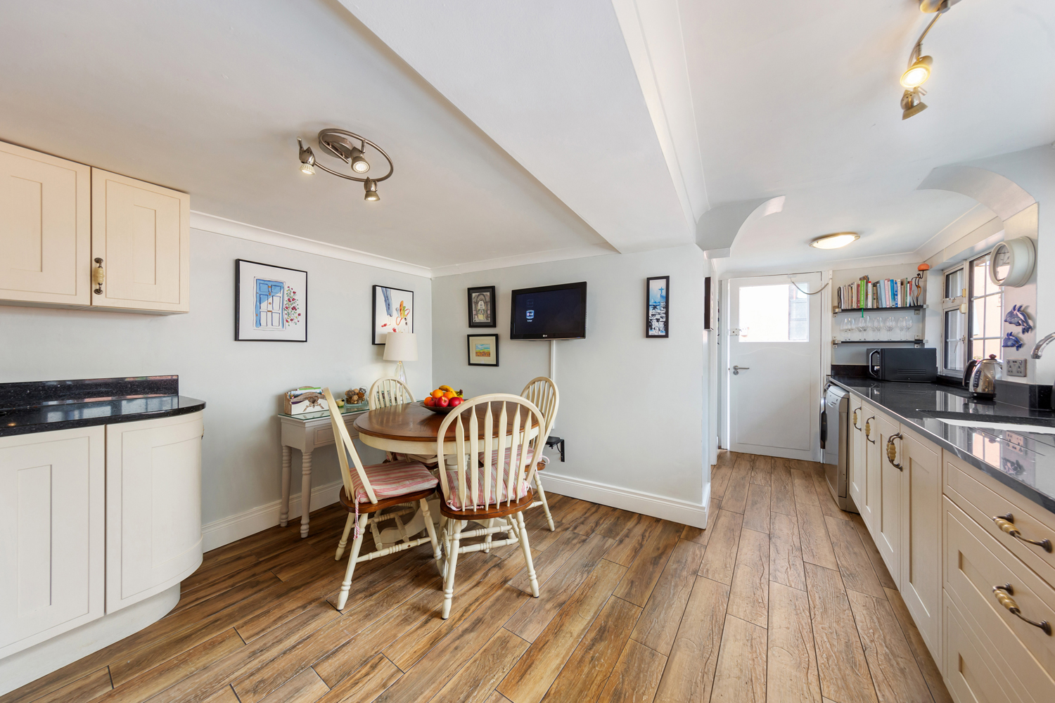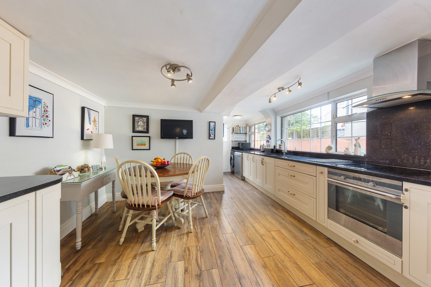 To the rear, an extension accommodates a generously sized kitchen, complete with beautiful granite worktops, along with an additional shower room, enhancing the home’s practicality.