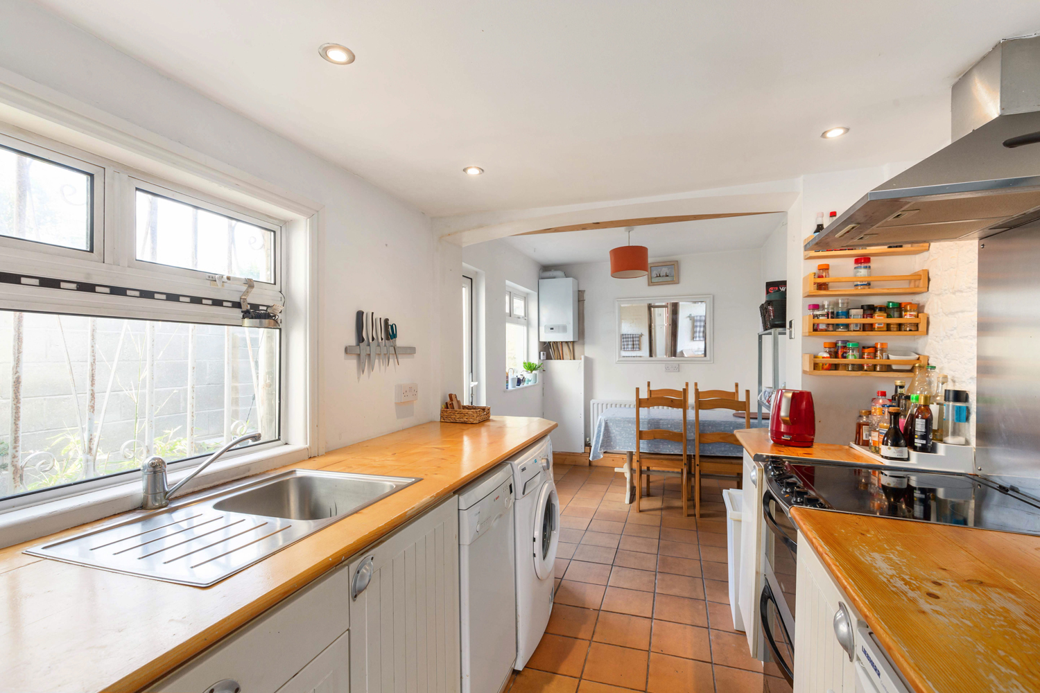 Fitted floor units with wooden worktops. Stainless steel sink units. Plumbed for washing machine and dishwasher. Understairs storage. Exposed brick wall. Tiled floor. Glow warm gas boilers. Door to garden.