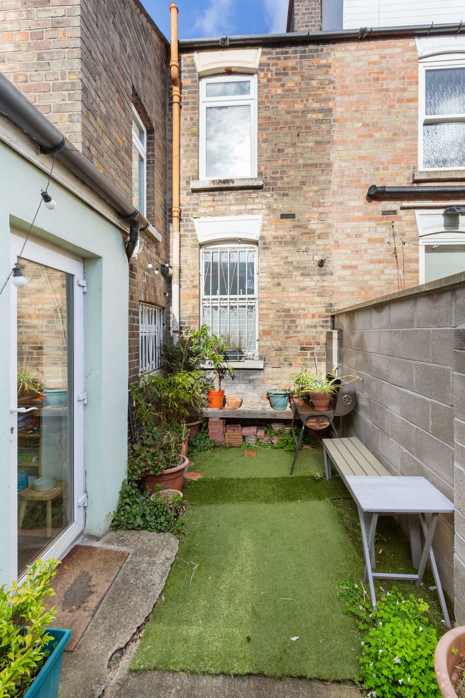 Upstairs, the return hosts a well appointed bathroom with wooden floors, a vaulted ceiling and a mix of tiled and exposed brick walls, while the first floor comprises two generous double bedrooms. Both bedrooms retain their original wooden floors and fireplaces, with the main bedroom spanning the width of the house and featuring built-in wardrobes. The second bedroom overlooks the rear garden and includes convenient shelving.