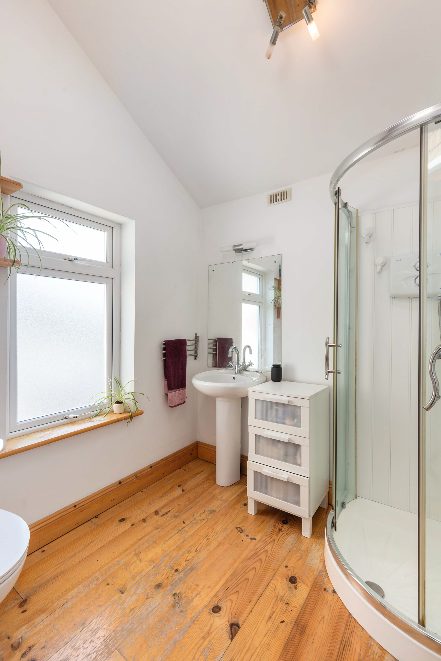 Wooden floors. Glazed shower cubicle with electric shower. Heated towel rail. Vaulted ceilings. Pedestal wash hand basin. WC. Exposed brick wall. Velux windows.