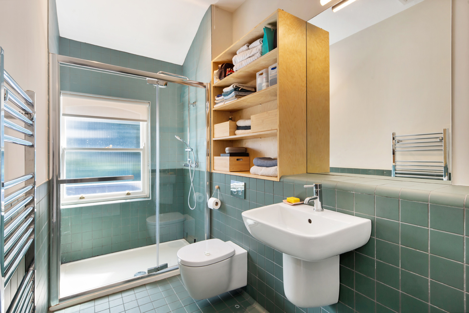 Tiled floor. Part tiled wall. Wash hand basin. WC. Large mirror. Glazed shower cubicle. Heated towel rail. Extractor fan. Stira staircase to attic. Gas boiler in attic.
