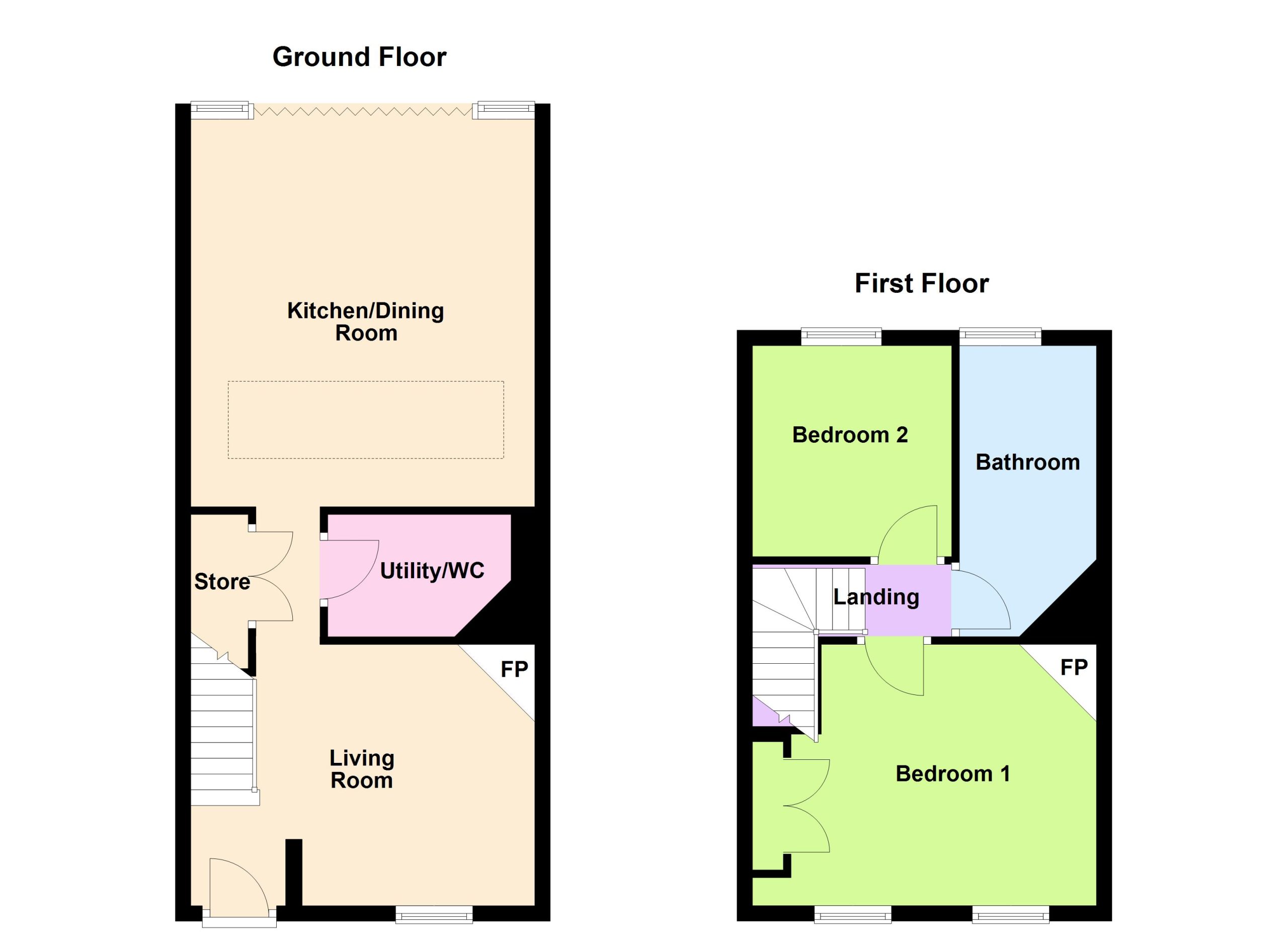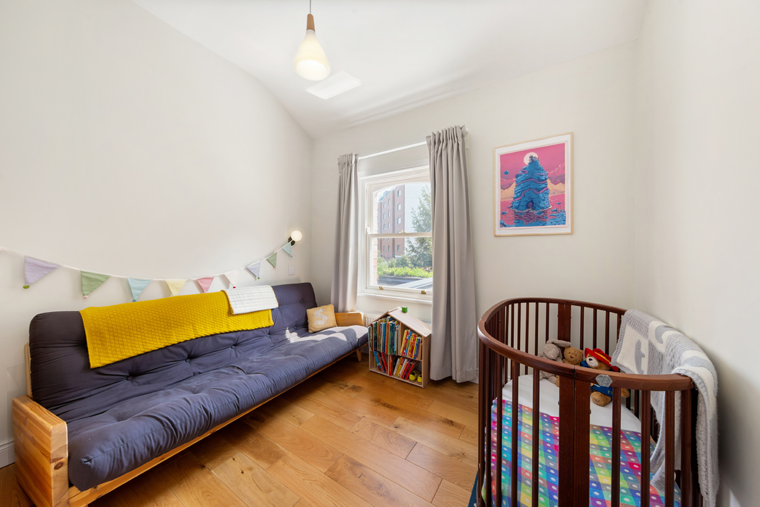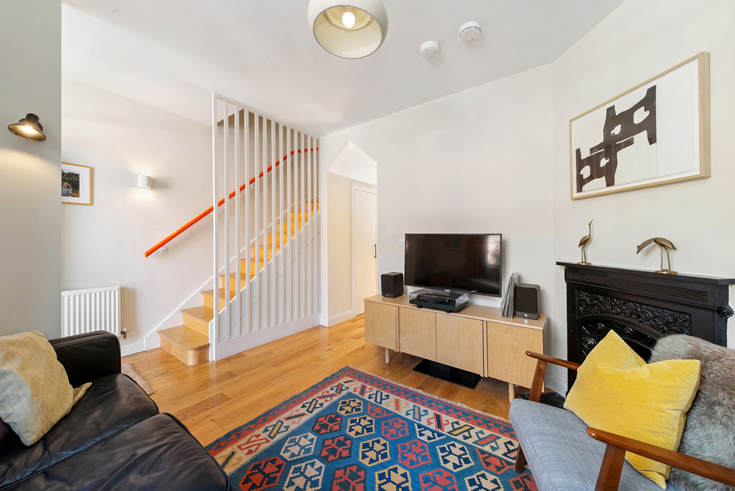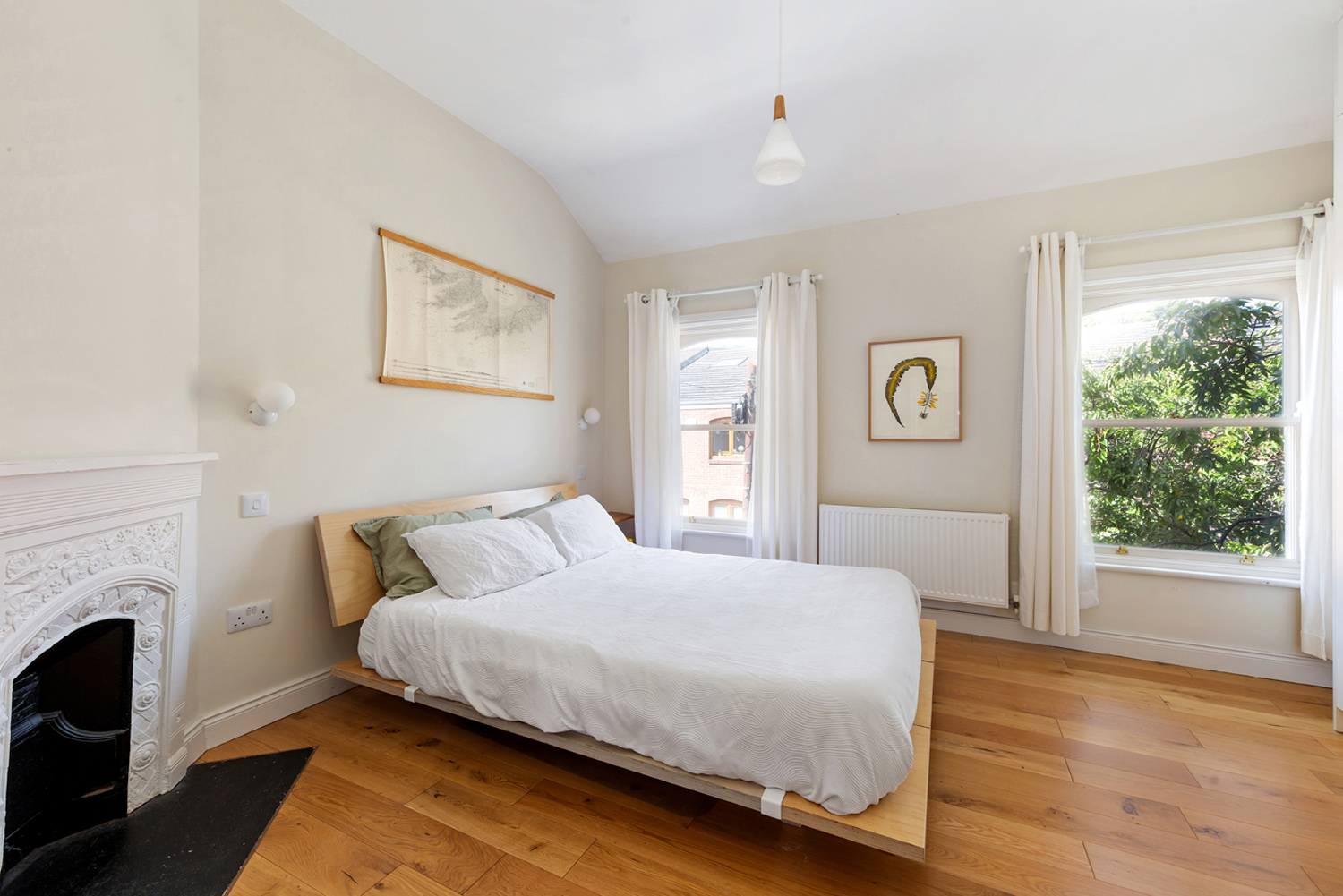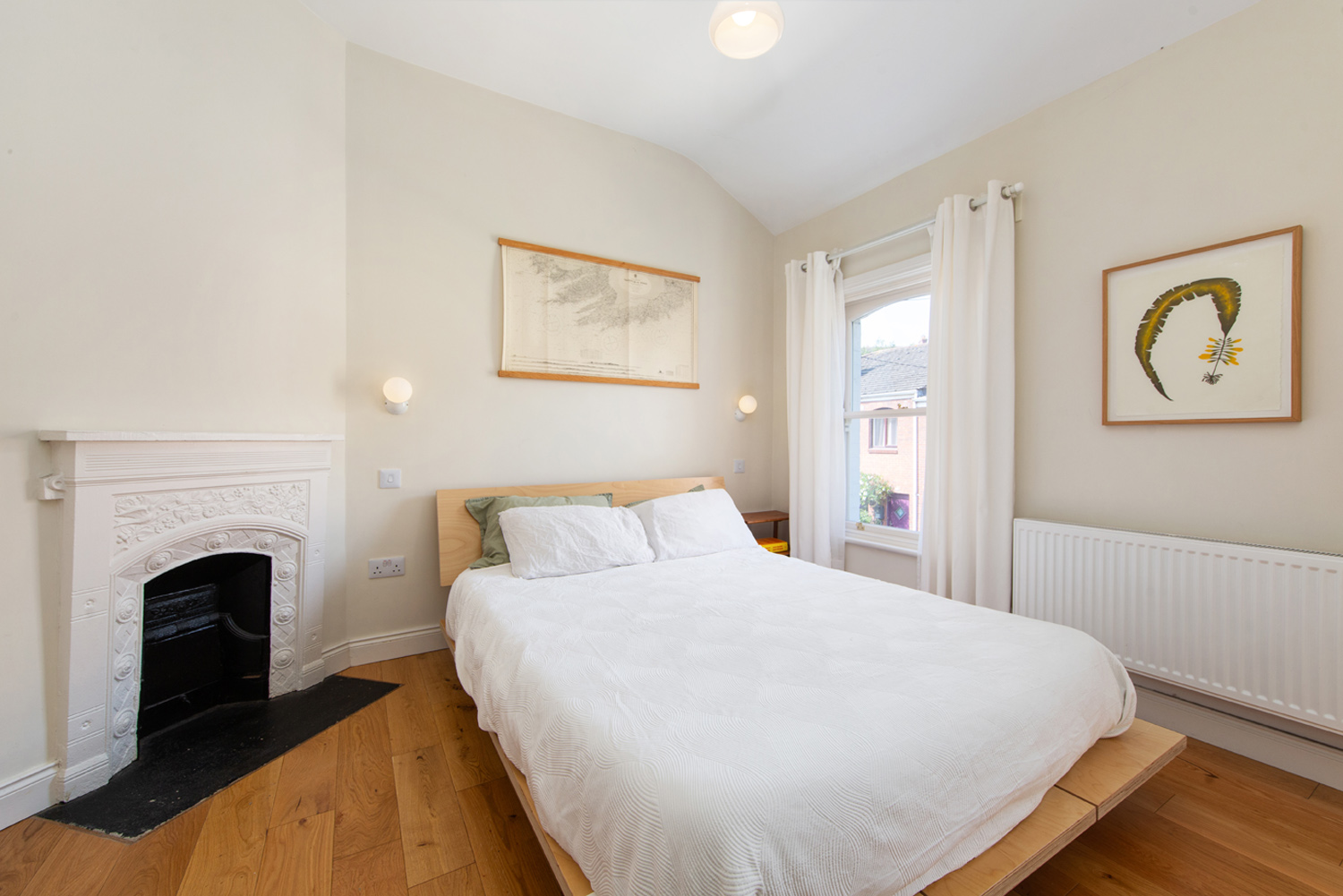 Upstairs, there are two generous double bedrooms. The main bedroom, spanning the full width of the house, boasts fitted wardrobes, wooden flooring and an original cast-iron fireplace. The second double bedroom, overlooking the garden, is equally inviting with wooden floors and wall-mounted lighting. A cleverly designed shower room, accessed from the light-filled landing, completes the accommodation with a sleek, modern finish.