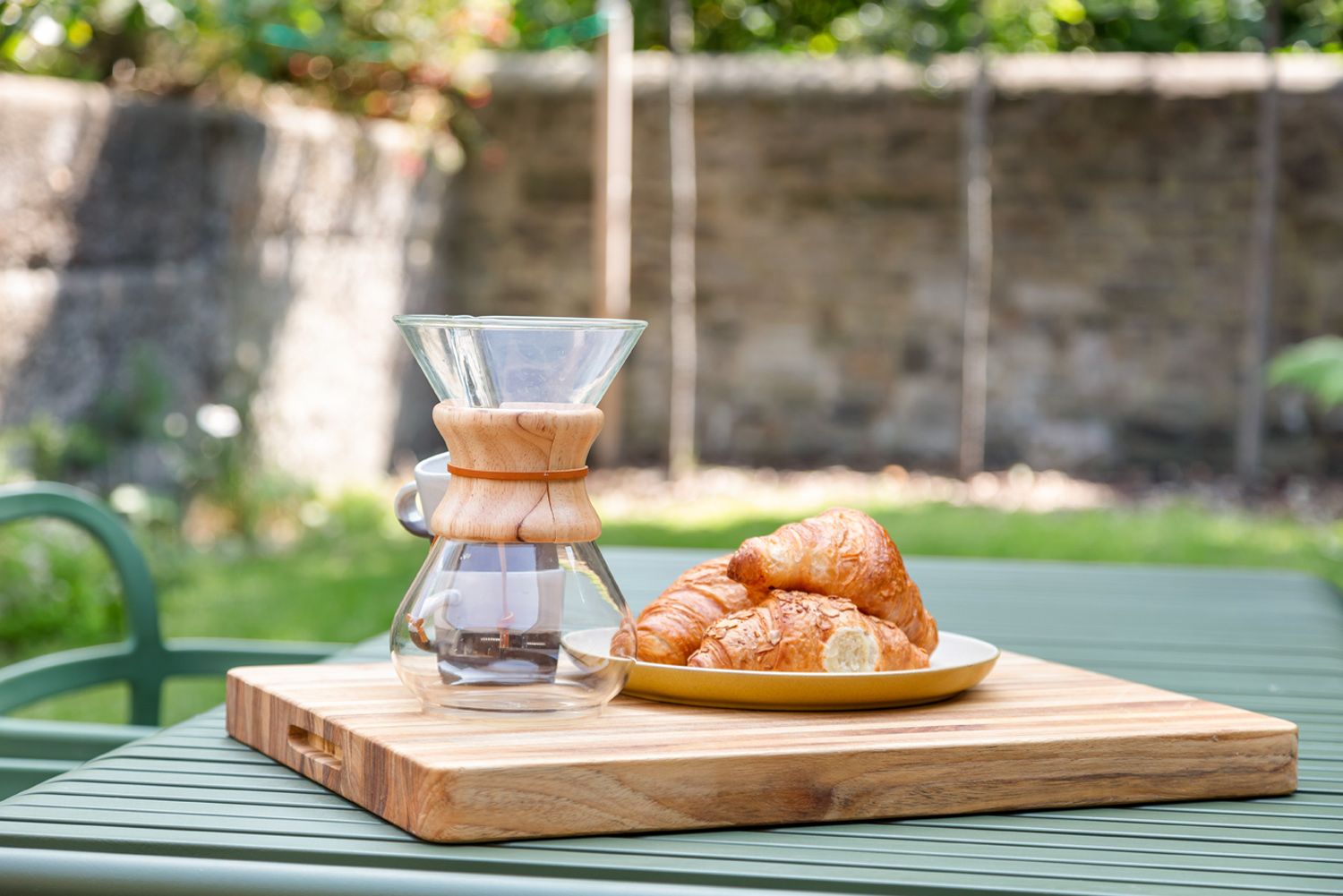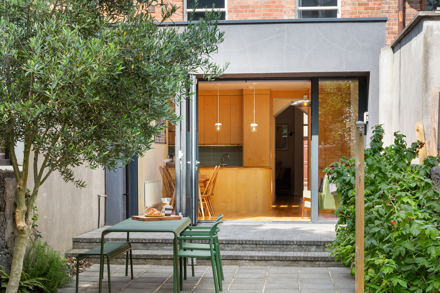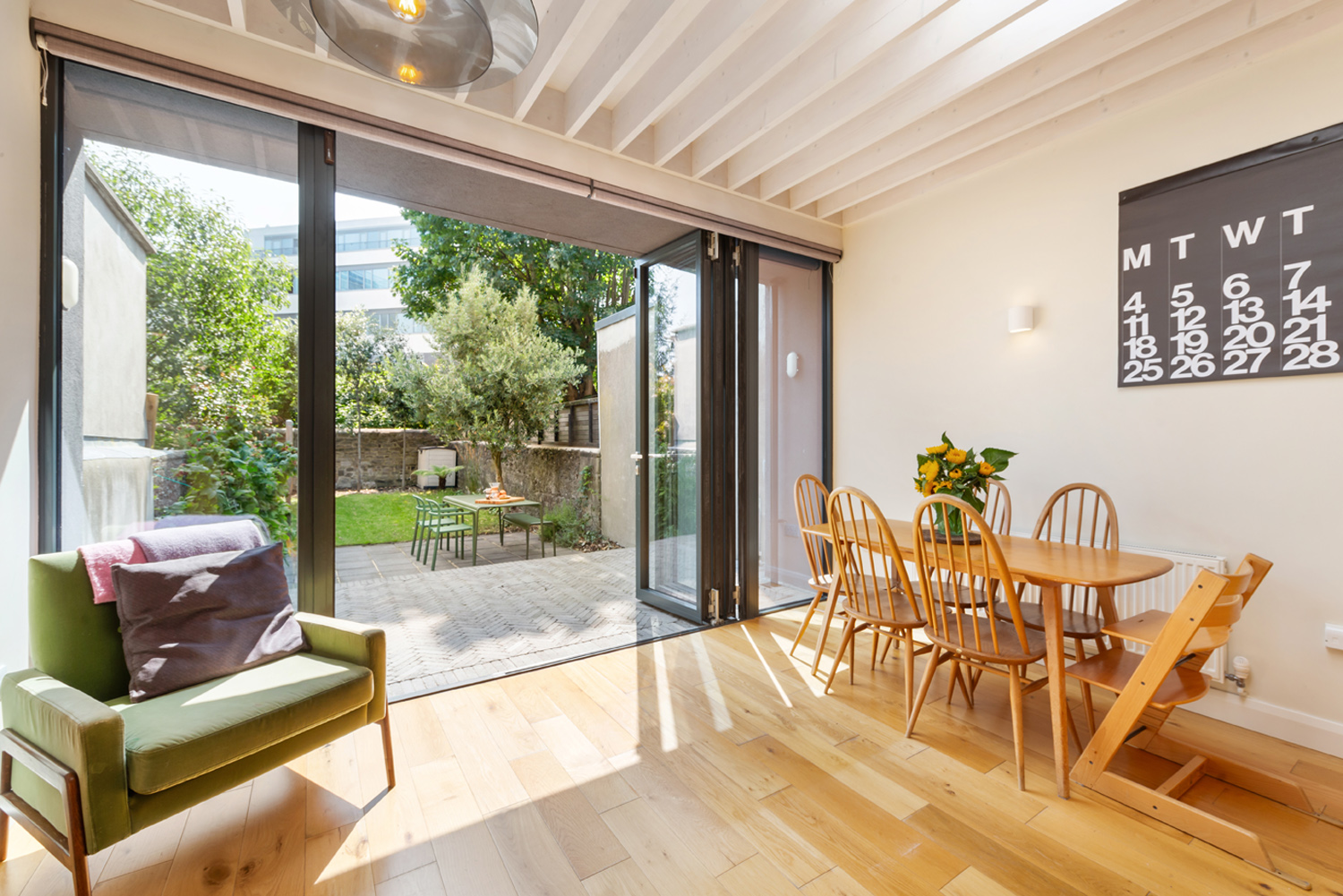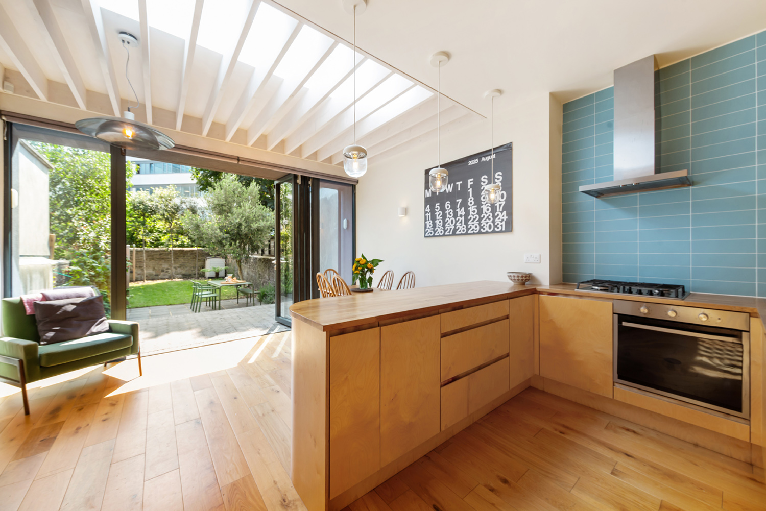 At the rear, the contemporary kitchen by Fearon Bros and extended dining area create a superb space for entertaining. Featuring bespoke plywood cabinetry, wooden worktops, integrated appliances and concertina doors opening onto the peaceful garden, it perfectly blends function with style.