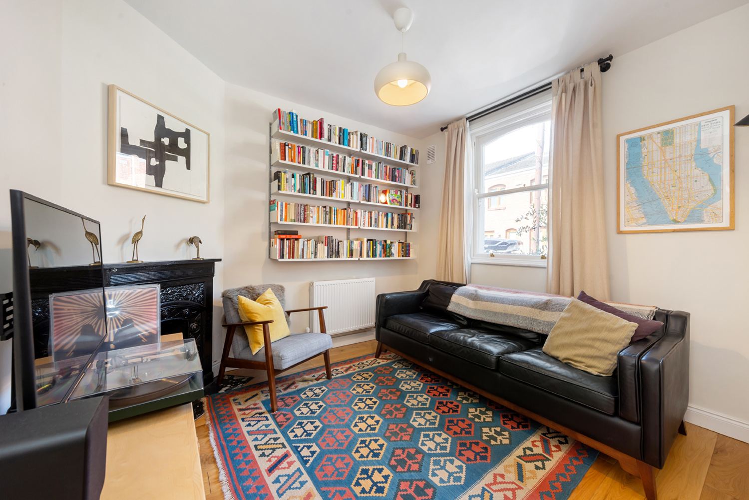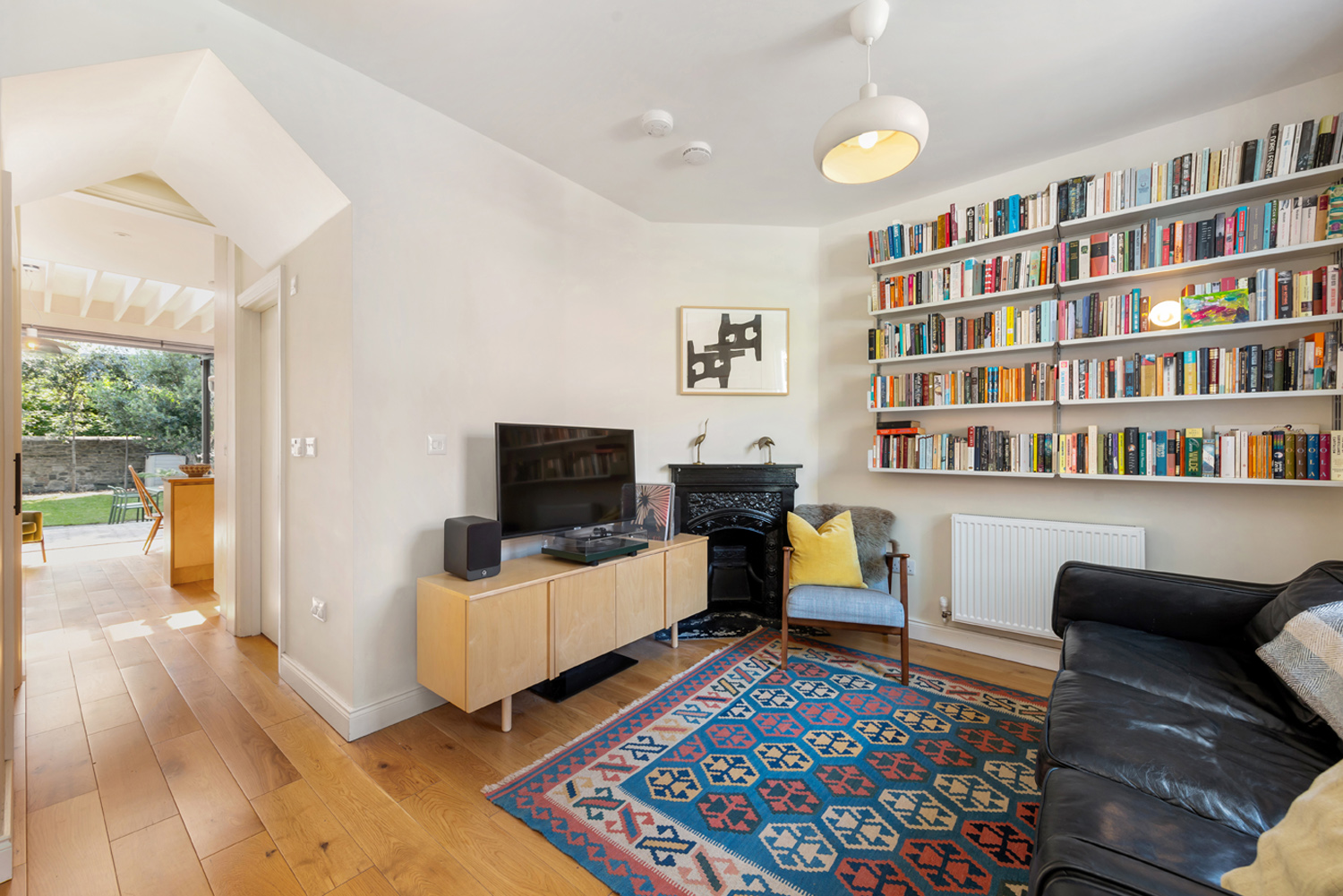 Engineered oak floor. Alarm panel. Vitsoe shelving. Original fireplace. TV Point.
