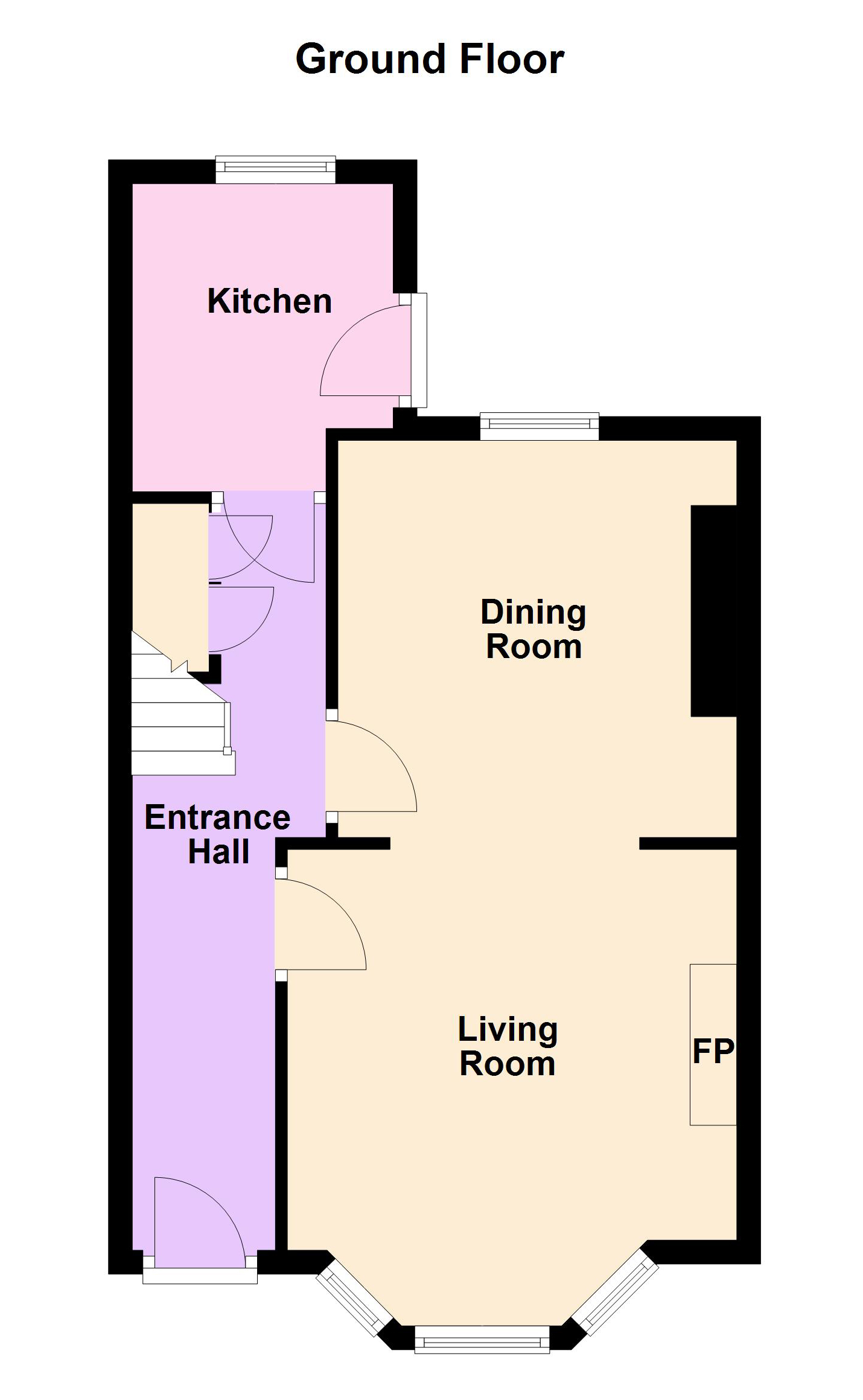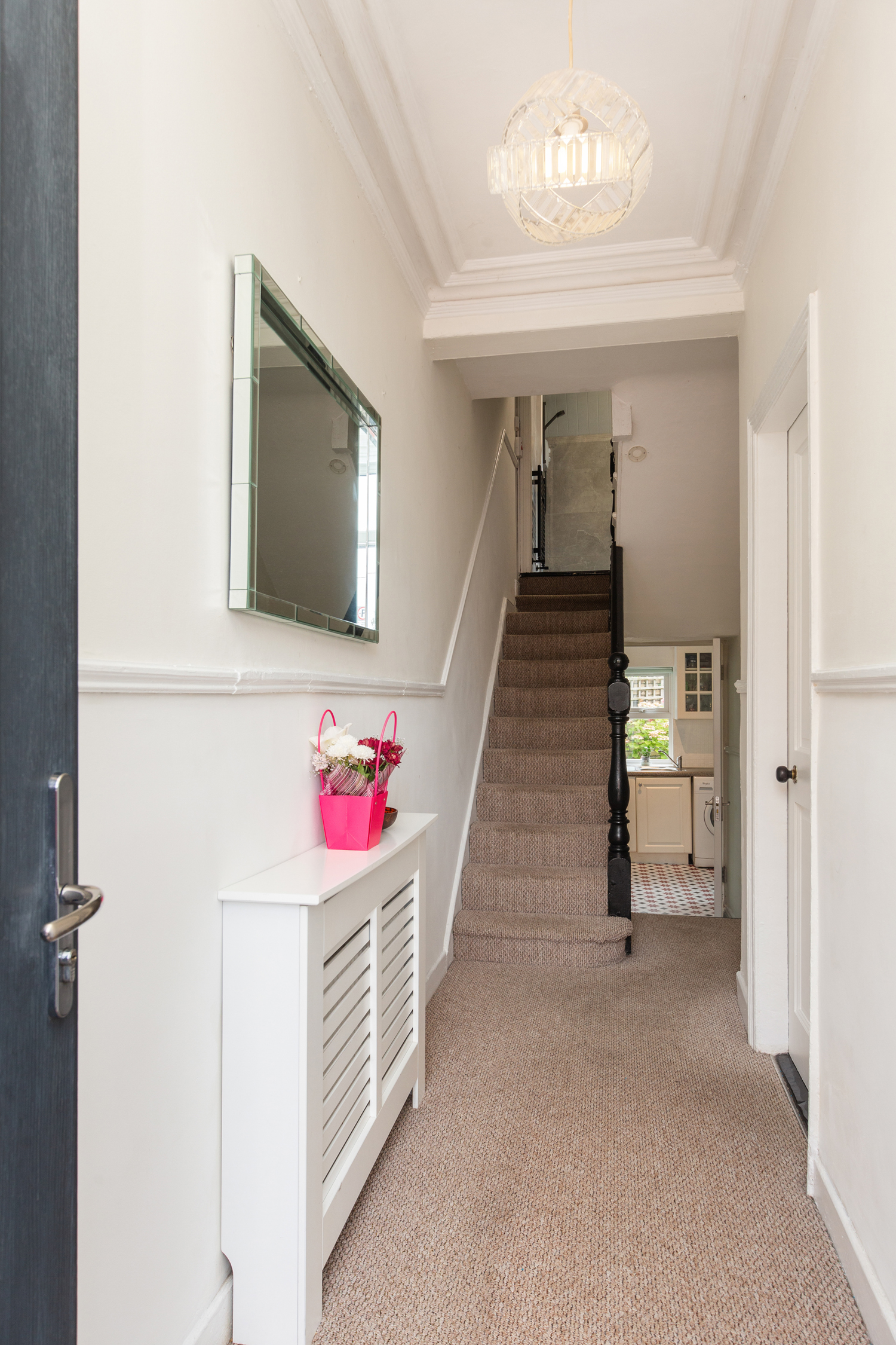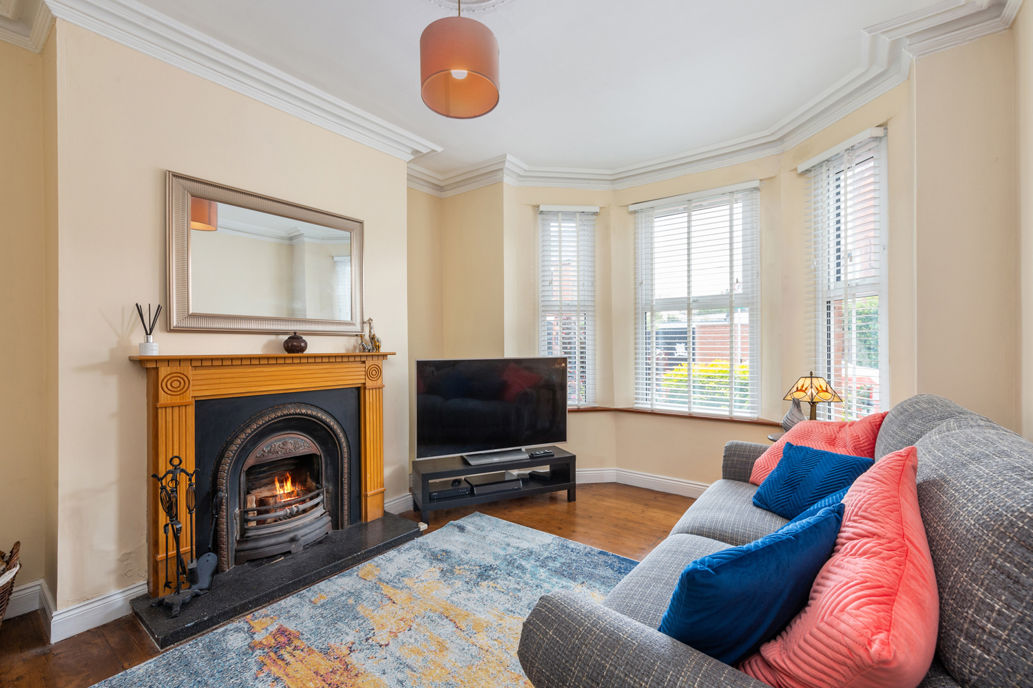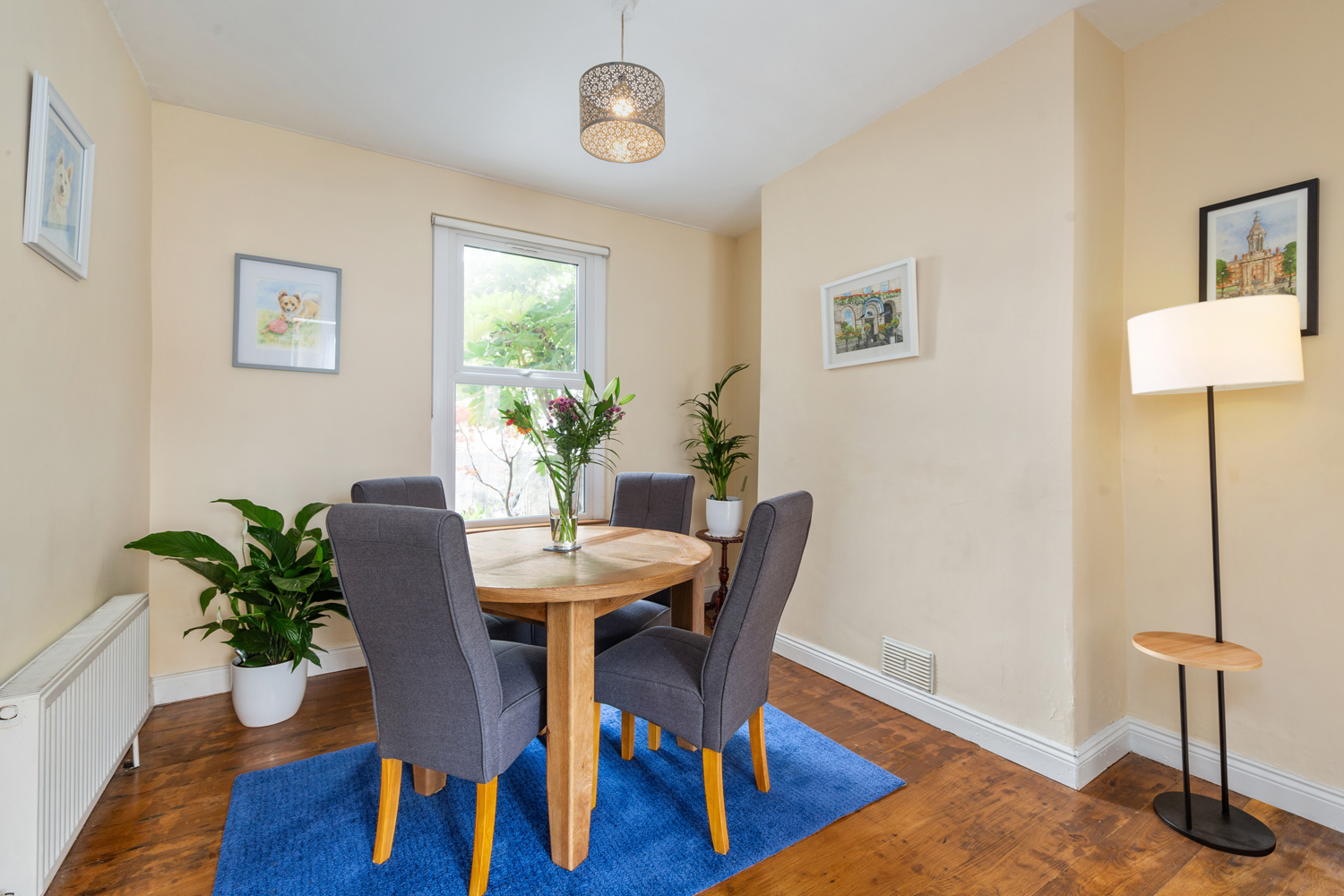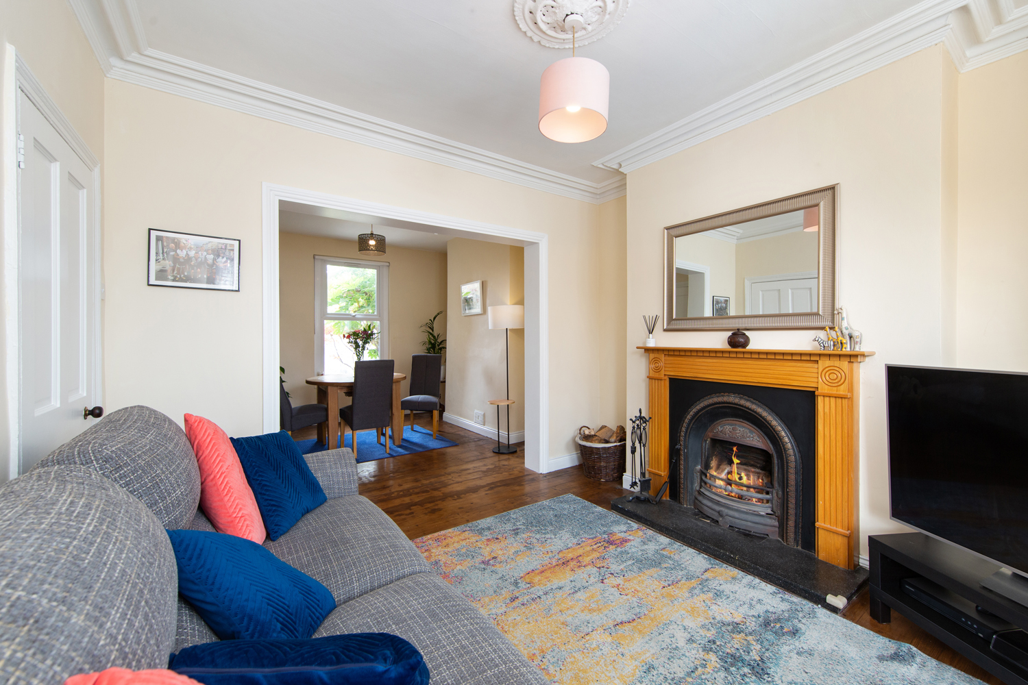 Upon entering, you are greeted by a neat, carpeted hallway complete with understairs storage, decorative ceiling cornicing, and dado rails. To the right lies the open-plan living and dining room—a bright, inviting space featuring a large bay window, original wooden floors, an open fireplace with a wooden surround and cast-iron inset, and beautiful period plasterwork on the ceiling.