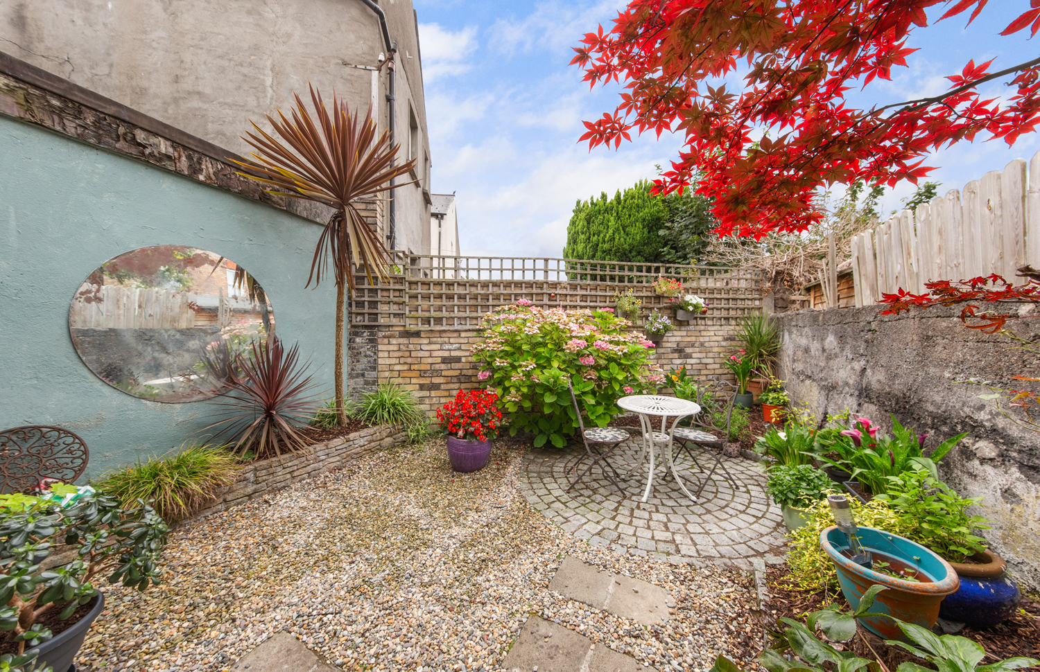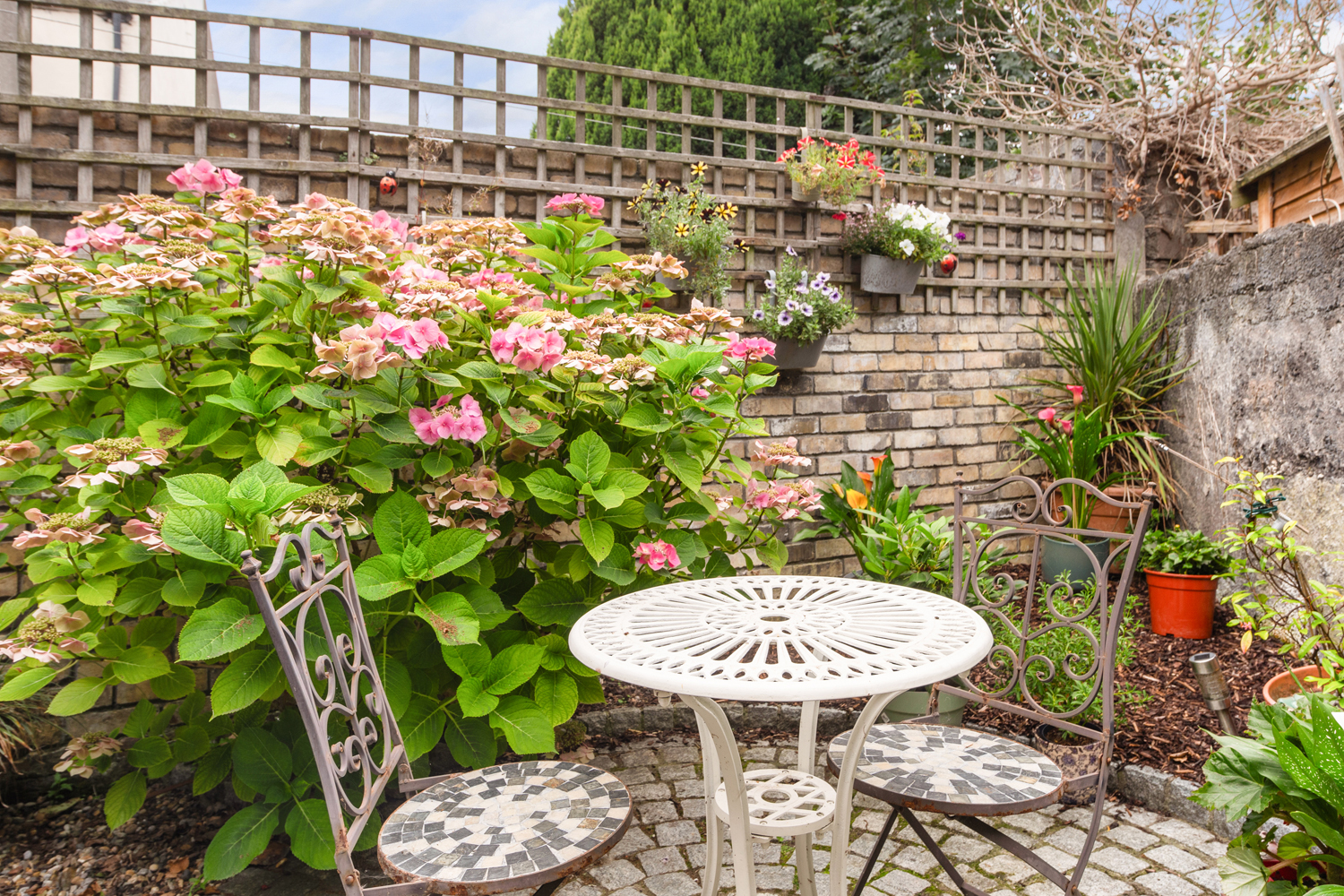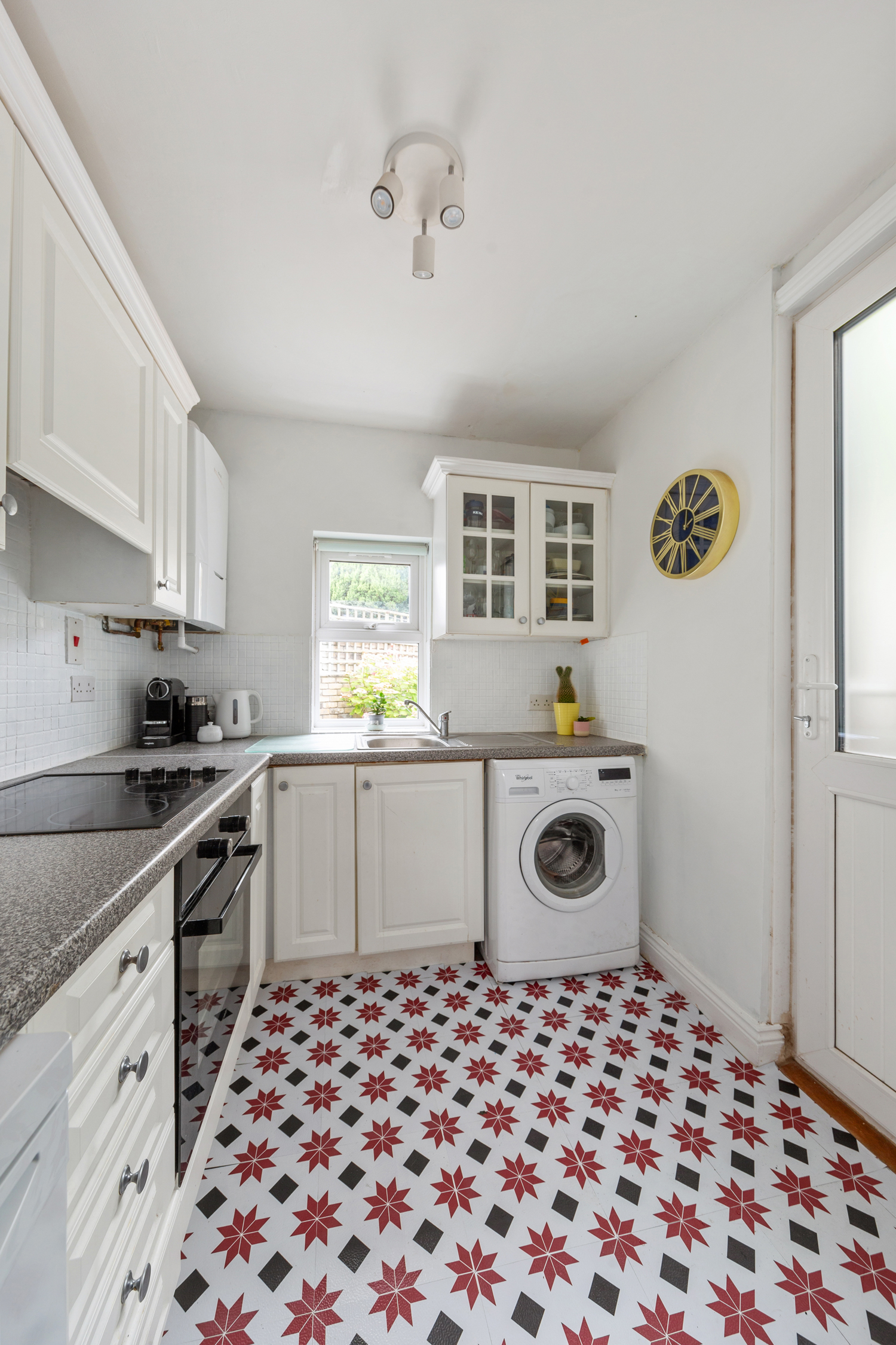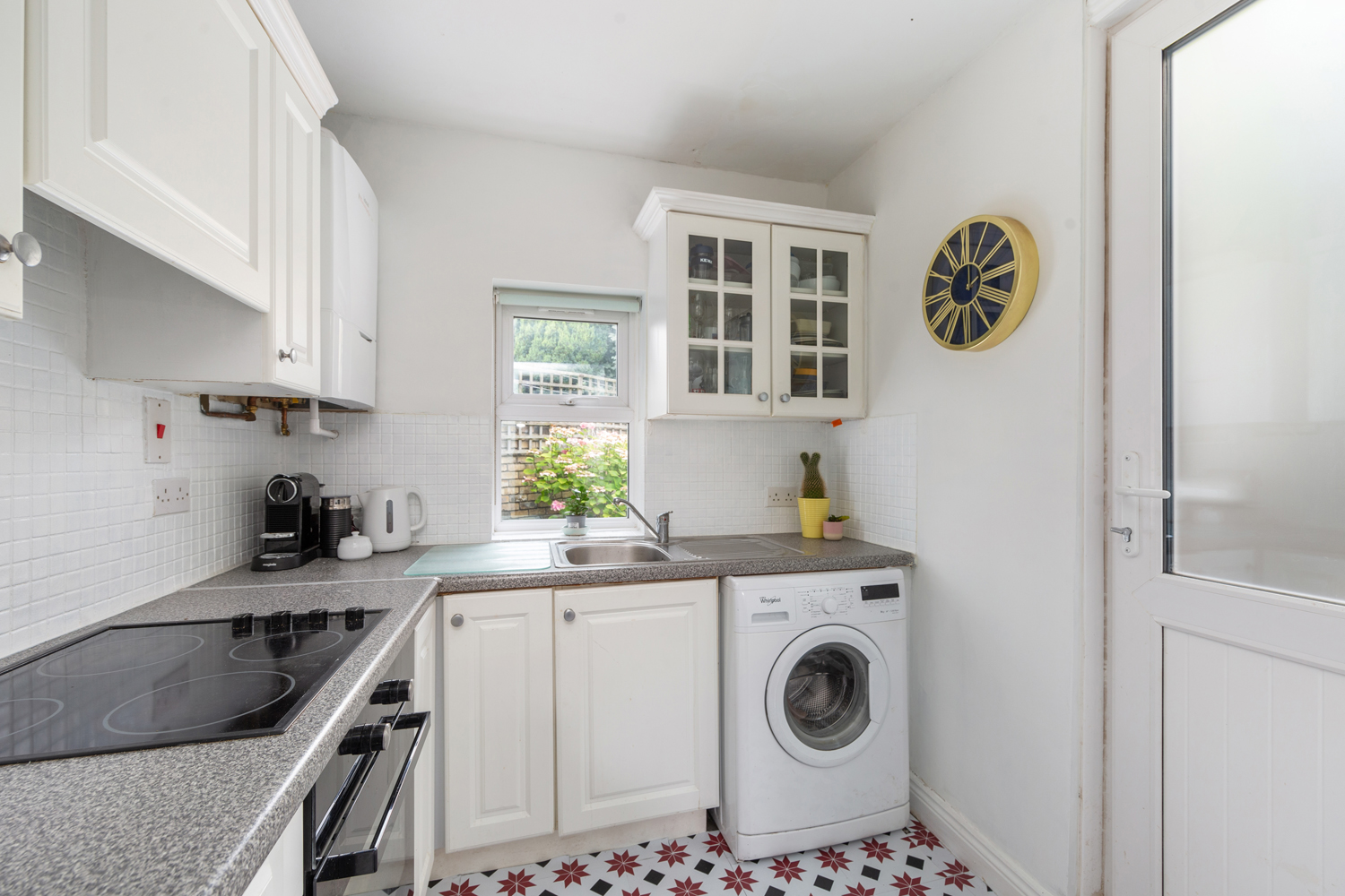 At the rear, the well-appointed kitchen offers fitted wall and floor units, a tiled floor, and direct access to the west-facing garden. This private suntrap enjoys light well into the evening—perfect for al fresco dining and easy outdoor living.