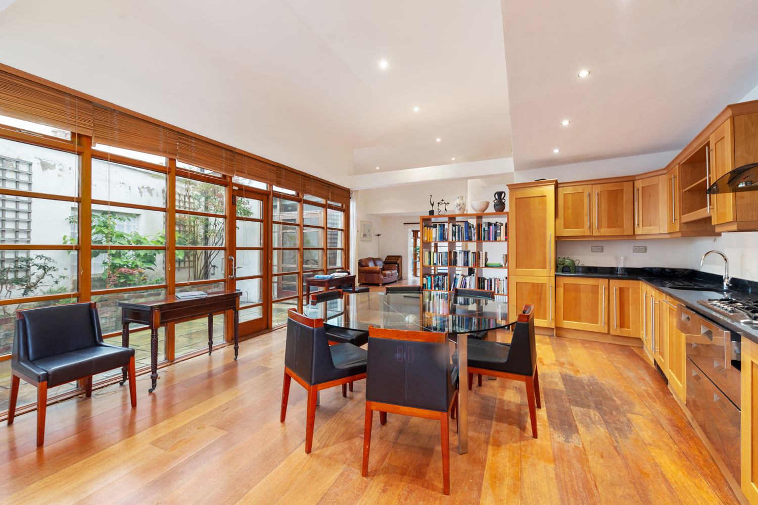 Solid wood floor. Fully fitted wall and floor units. Recessed stainless steel sink unit. Electric over. Gas hob. Extractor fan. Integrated dishwasher. Integrated fridge freeze. High ceiling 3.9m Door to courtyard. Storage cupboard.