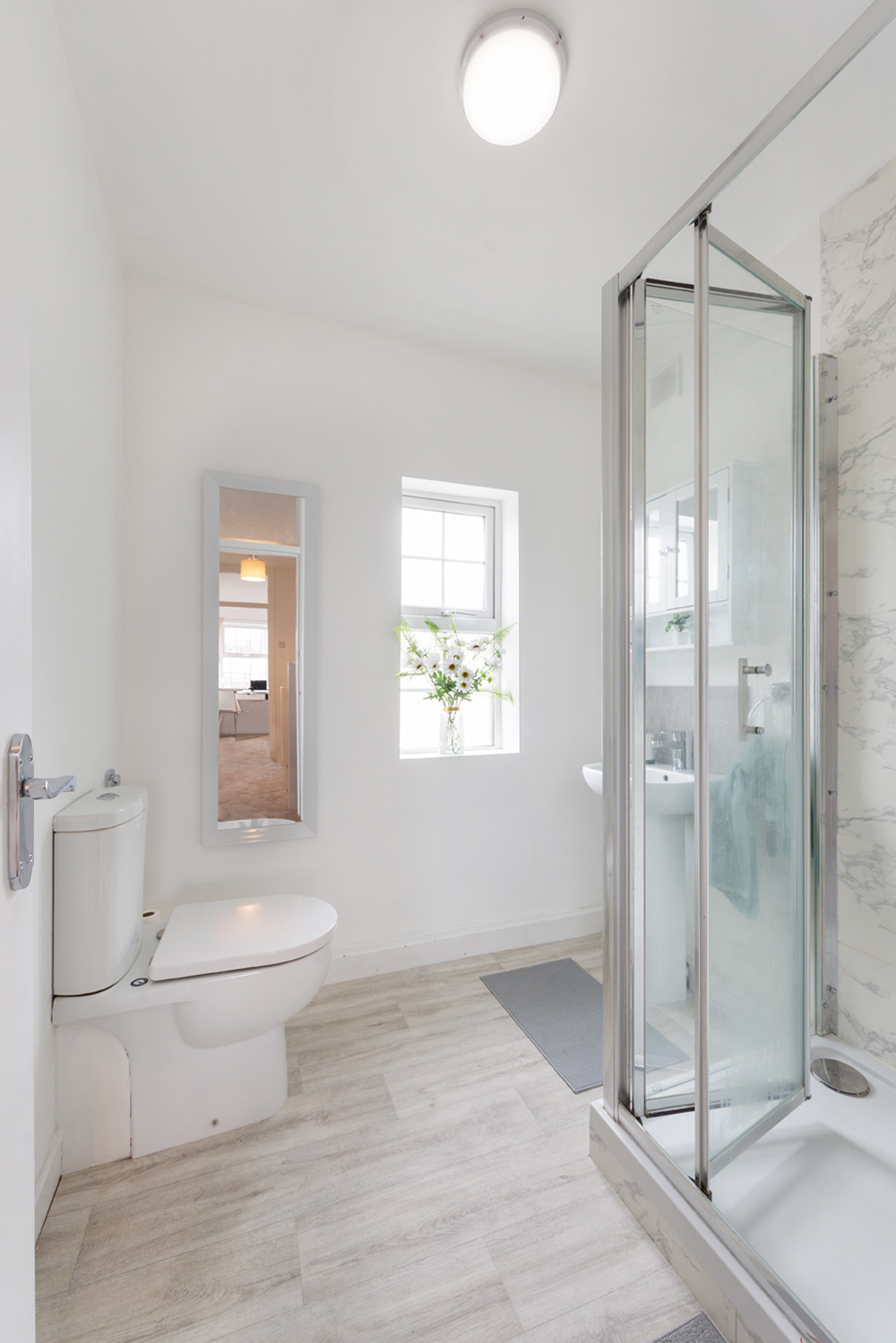 Laminate wood floor. Shower cubicle. Wash hand basin. WC.