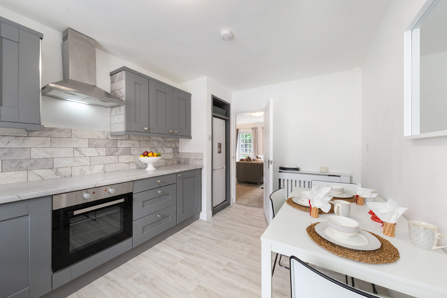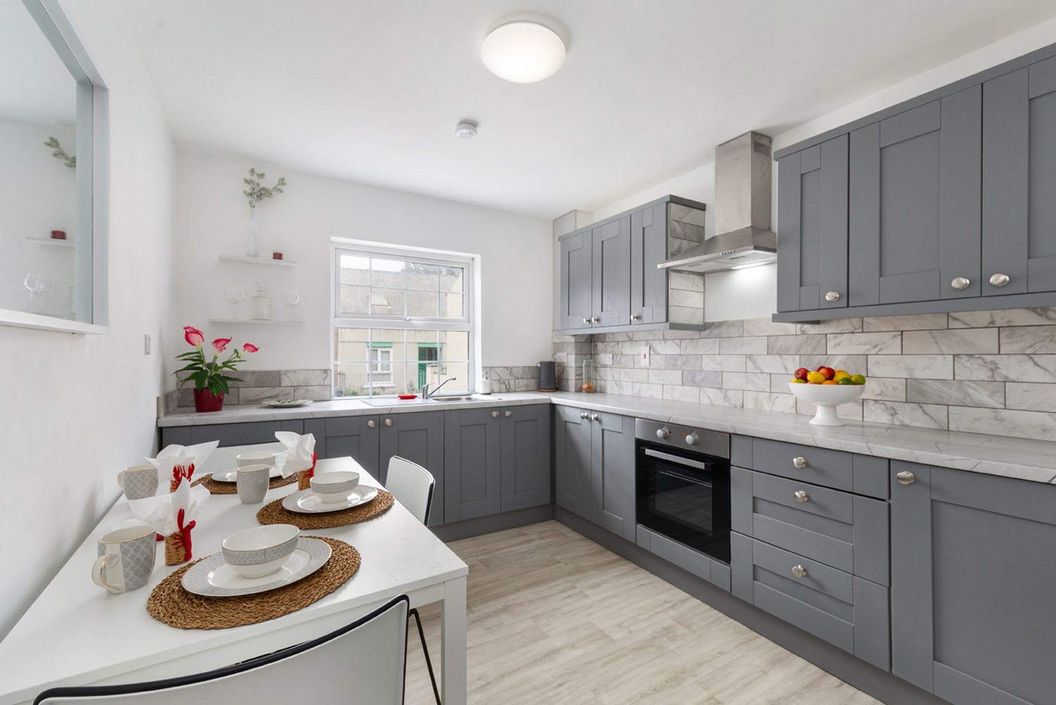 front of the house lies the generously sized kitchen, recently upgraded with modern fitted units and a