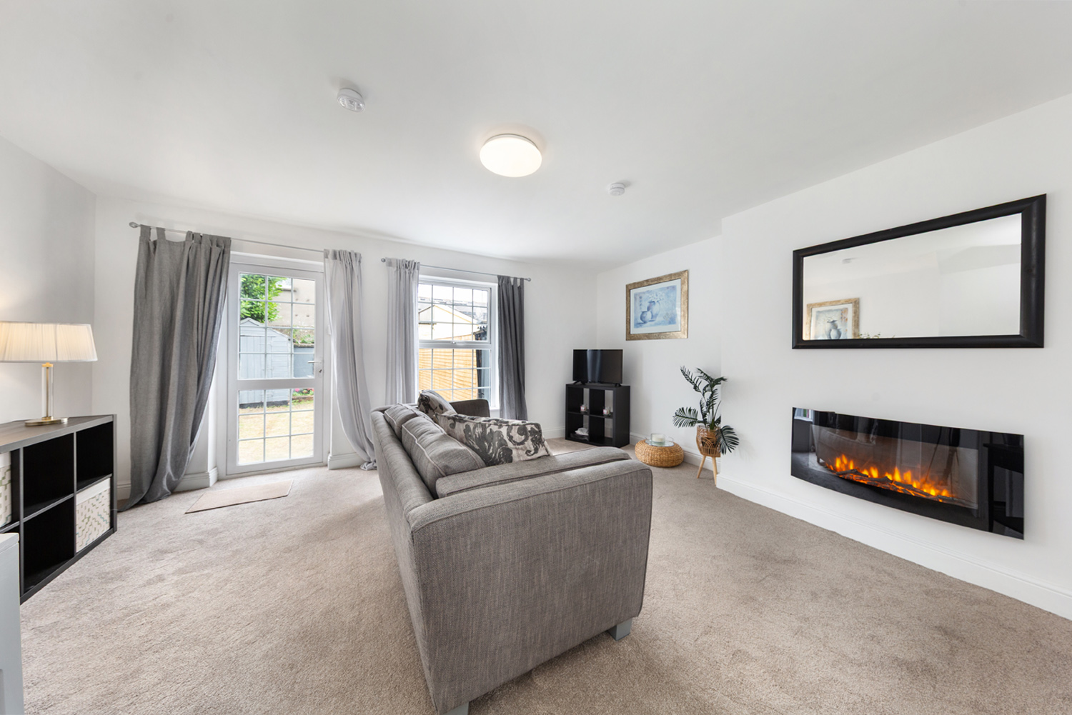 Electric fire. TV point Understairs storage. Glow warm gas boiler. Doors to garden.