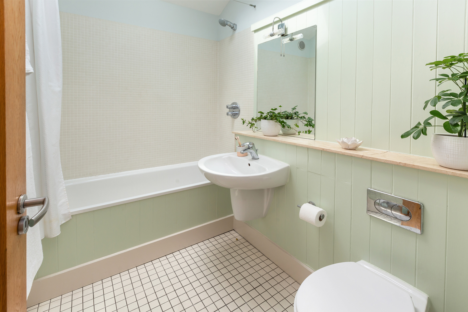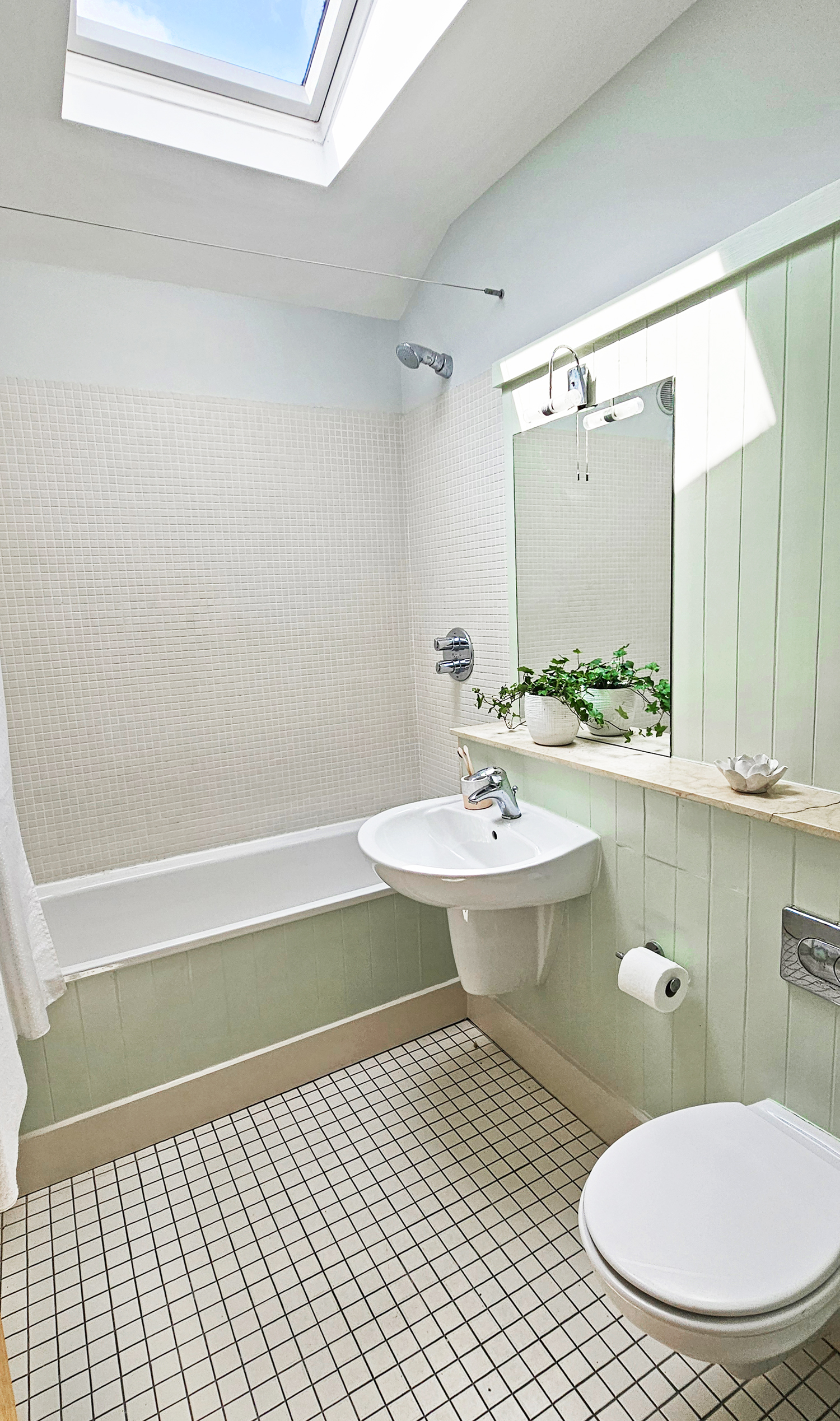 The main bathroom is well-appointed with tiled flooring, a Velux window, and a bath with shower attachment.