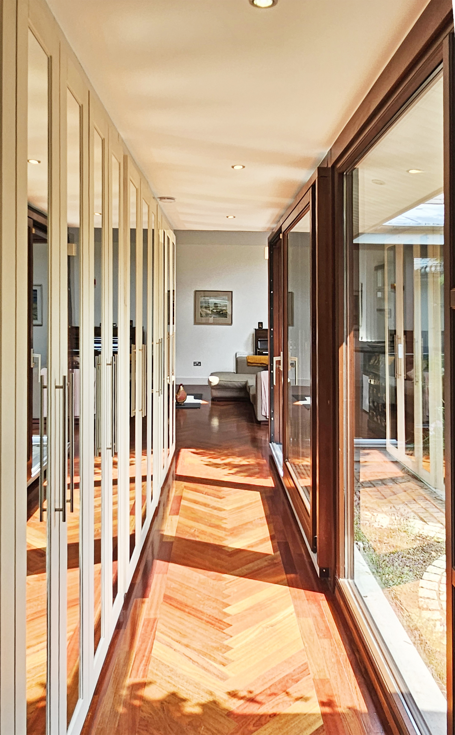 Jatobá hardwood floor. Mirrored storage down entire length with shelved hot press and immersion. Plumbed for washing machine and dryer. Stainless steel sink units. Large sliding doors to courtyard.