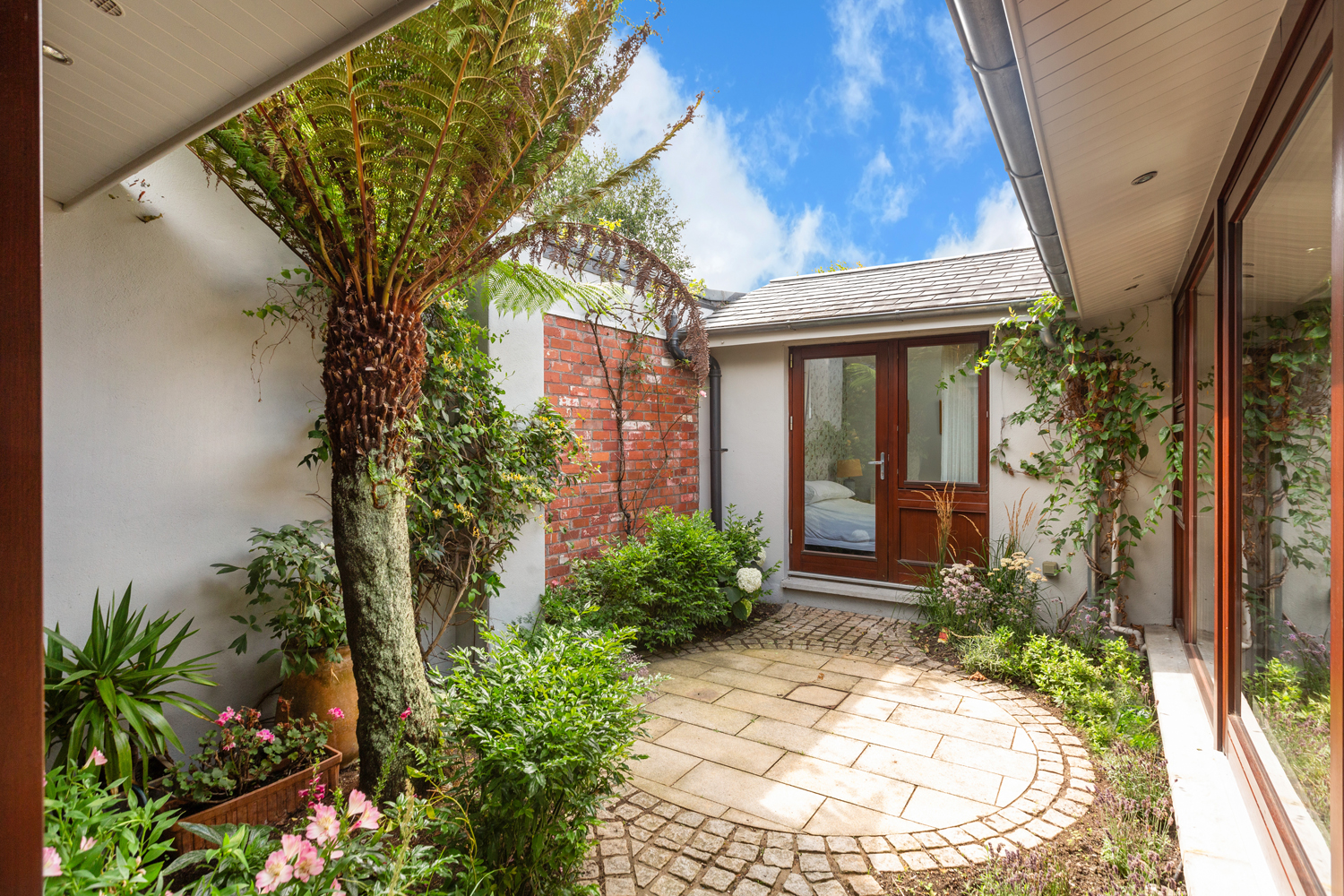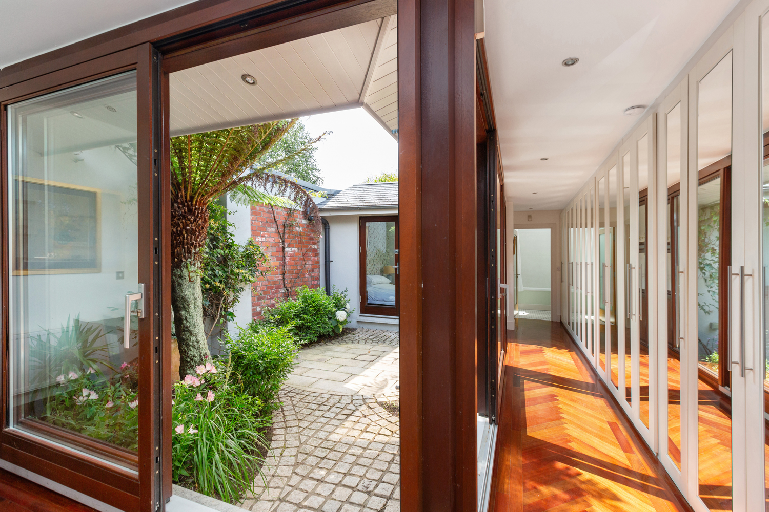 A seamless continuation of the flooring leads through to the private, west- and south-facing courtyard garden – a tranquil outdoor retreat with cobblestones, flower beds, and an abundance of sunlight in the afternoon and evening.