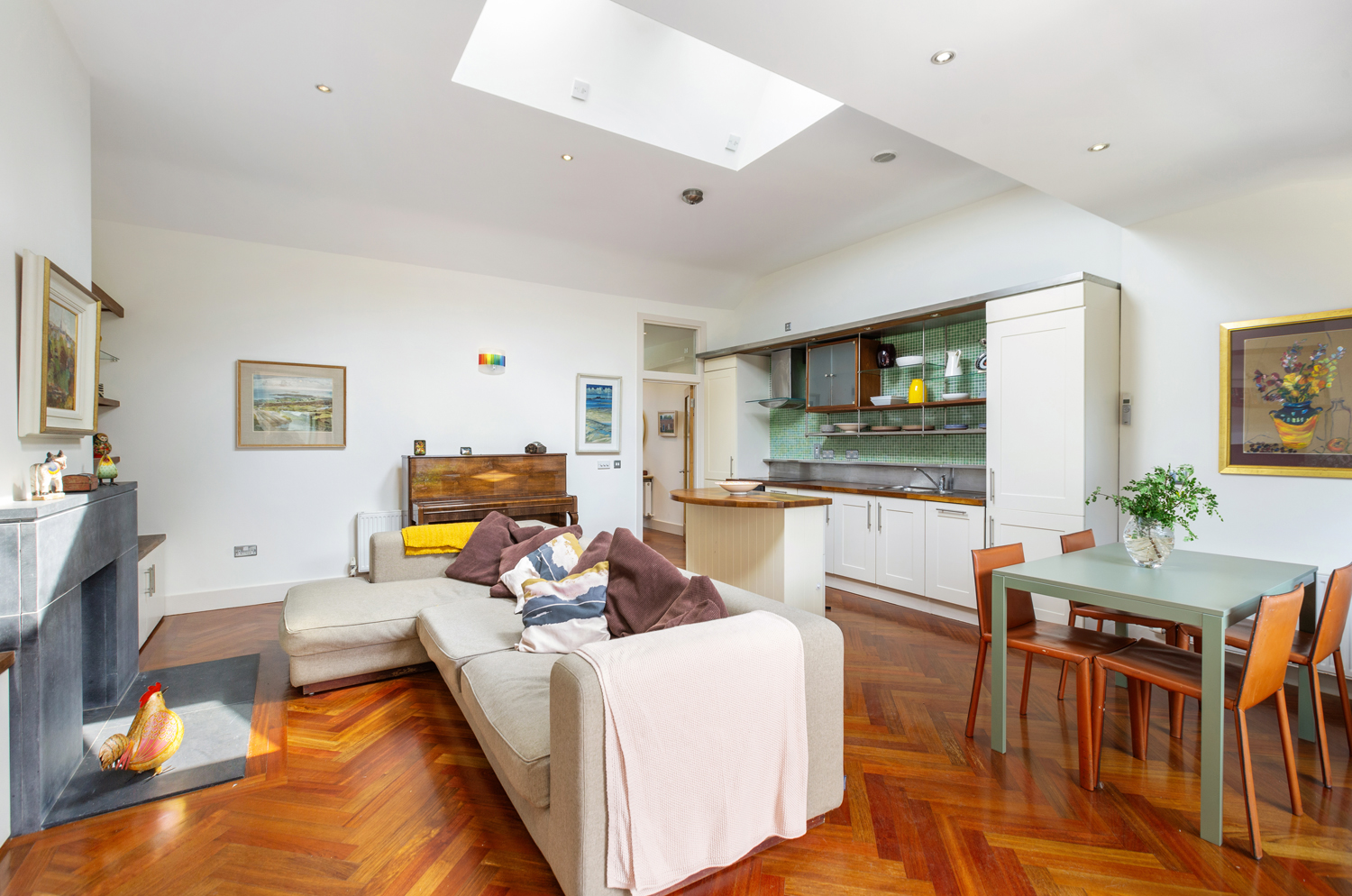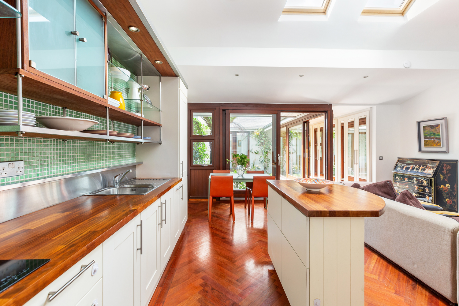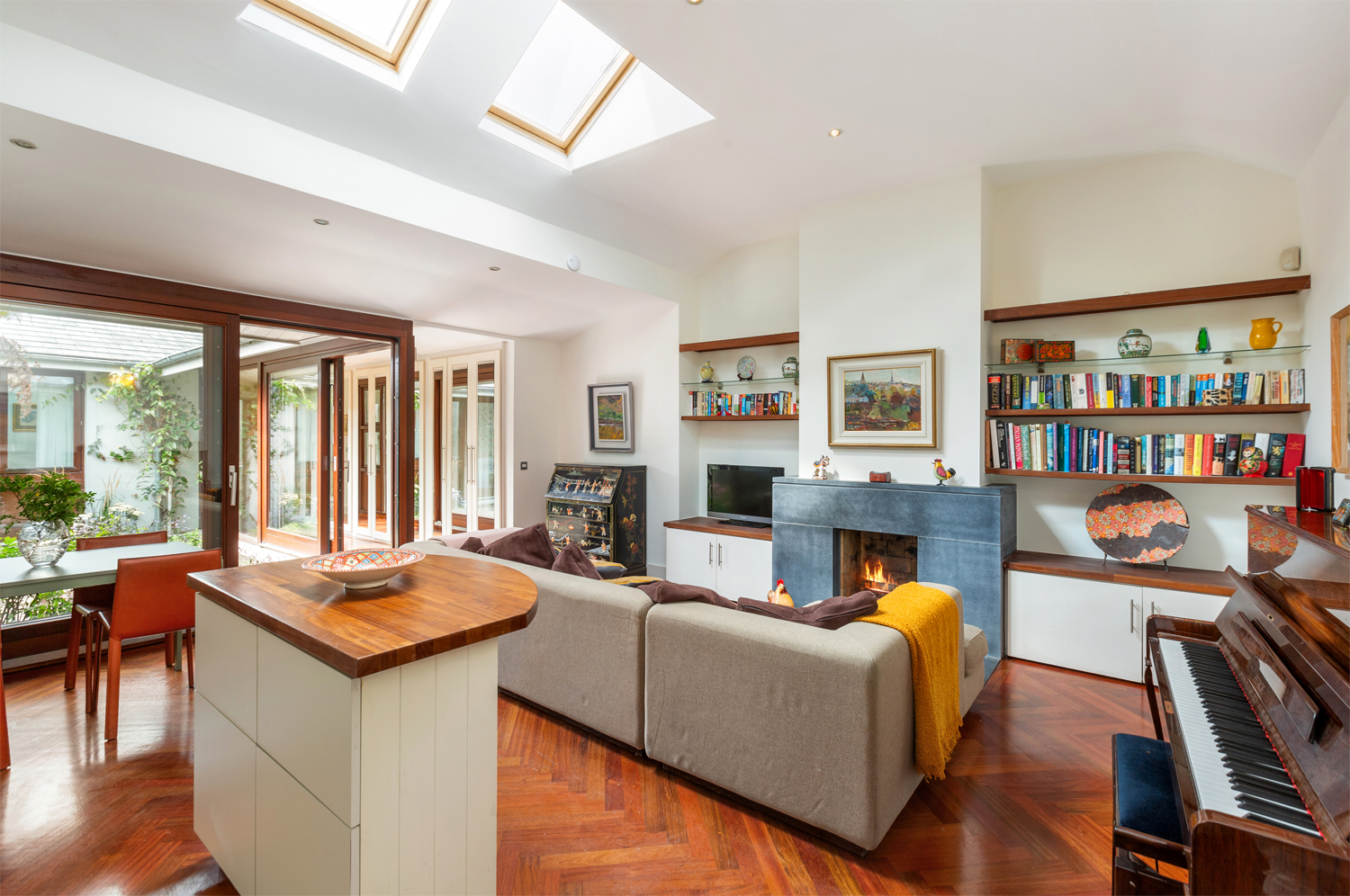 Vaulted ceiling. Jatobá hardwood floor. Roof lights * 2. Open fireplace with slate hearth and surround. Built in shelving and storage. Large sliding door to courtyard.Fitted wall and floor units. There isn’t actually a fridge freezer in situ, just a place for one.Stainless steel sink units. Fitted shelving. Electric oven, hob and extractor fan. Alarm panel. Integrated dishwasher and moveable Island.