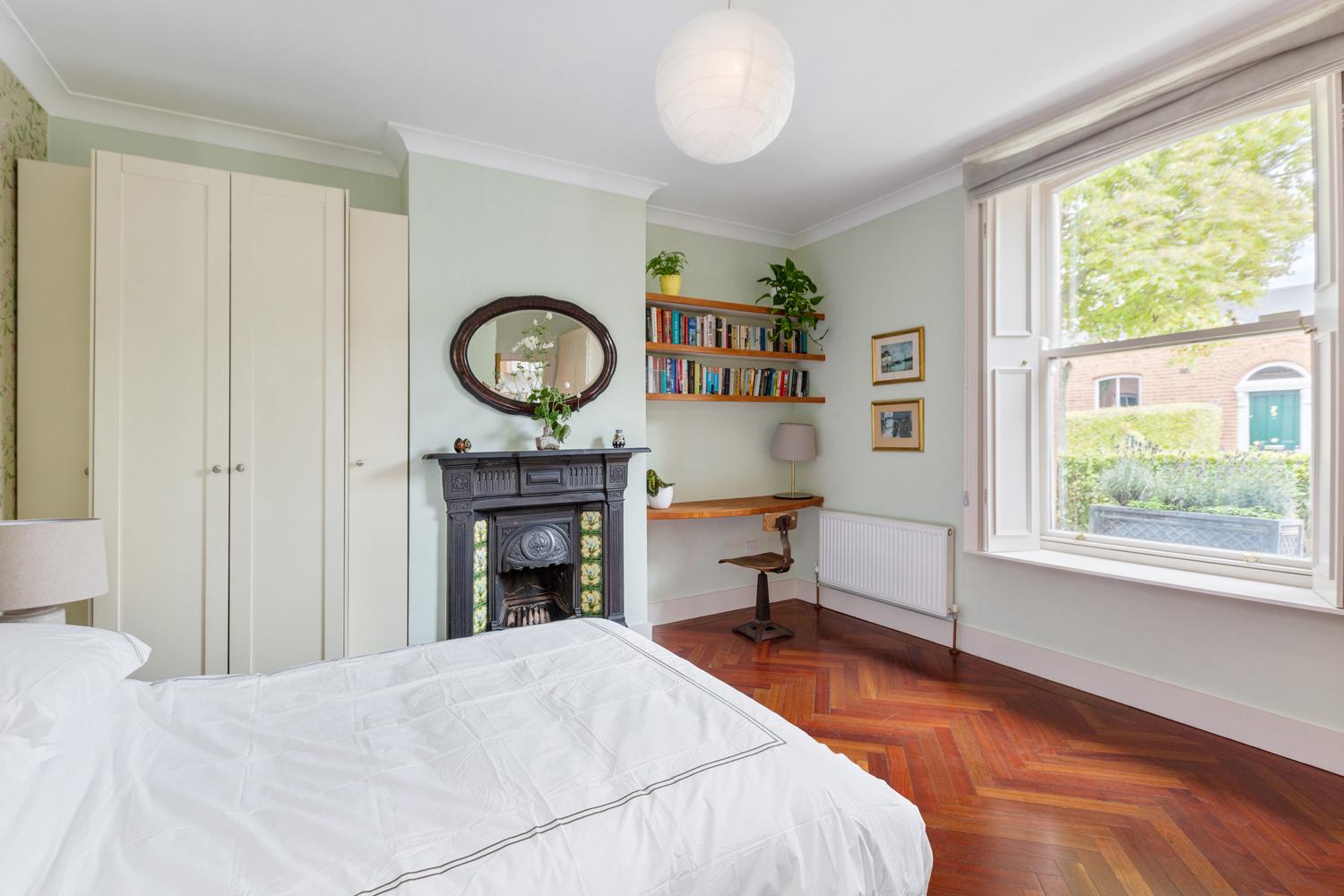 Jatobá hardwood floor. Original cast iron fireplace. Ceiling cornicing. Built in wardrobes. Window shutters. Built in desk and shelving. Phone point.
