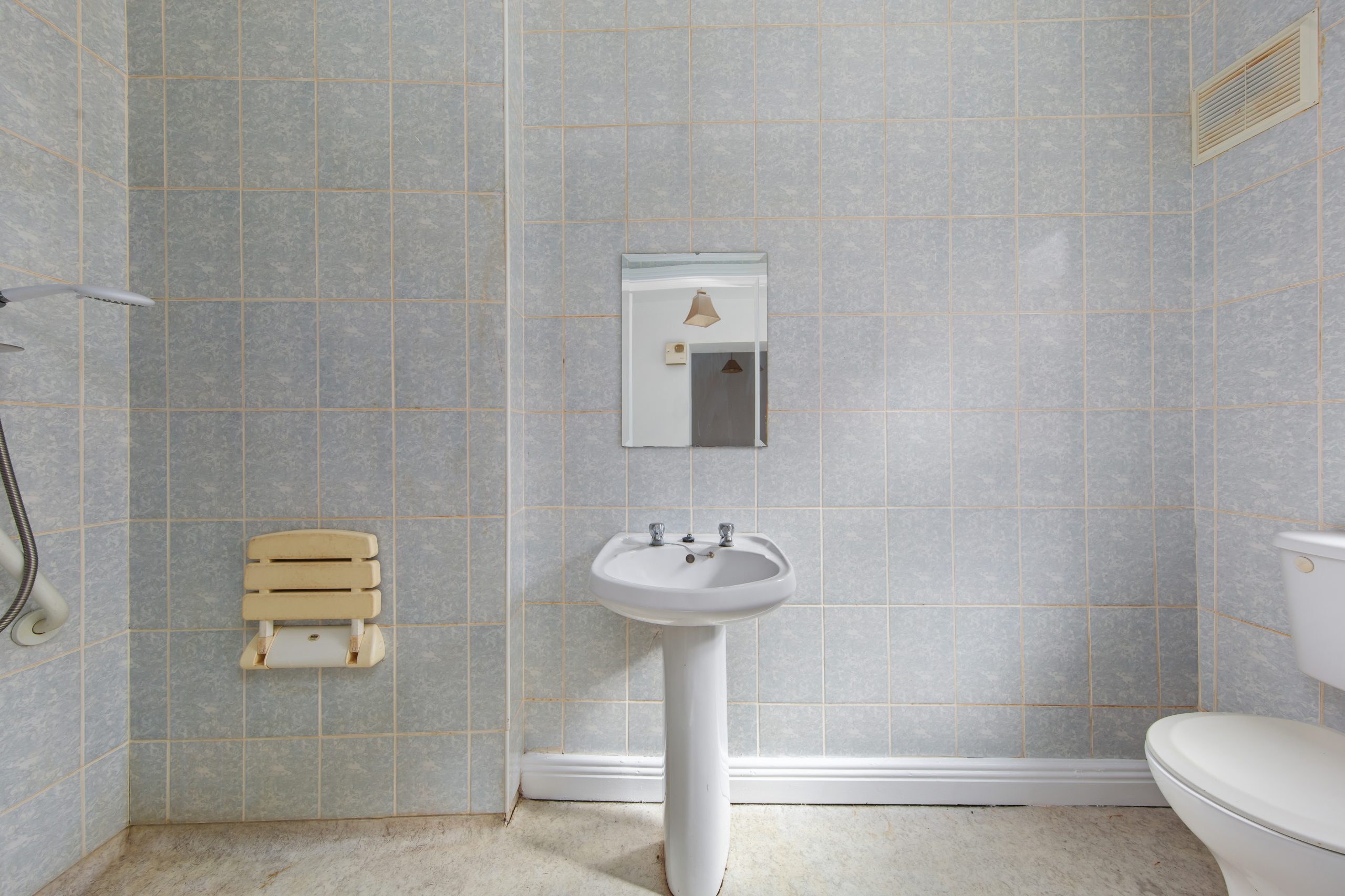 Linoleum flooring. WC. Wash hand basin. Shower enclosure.