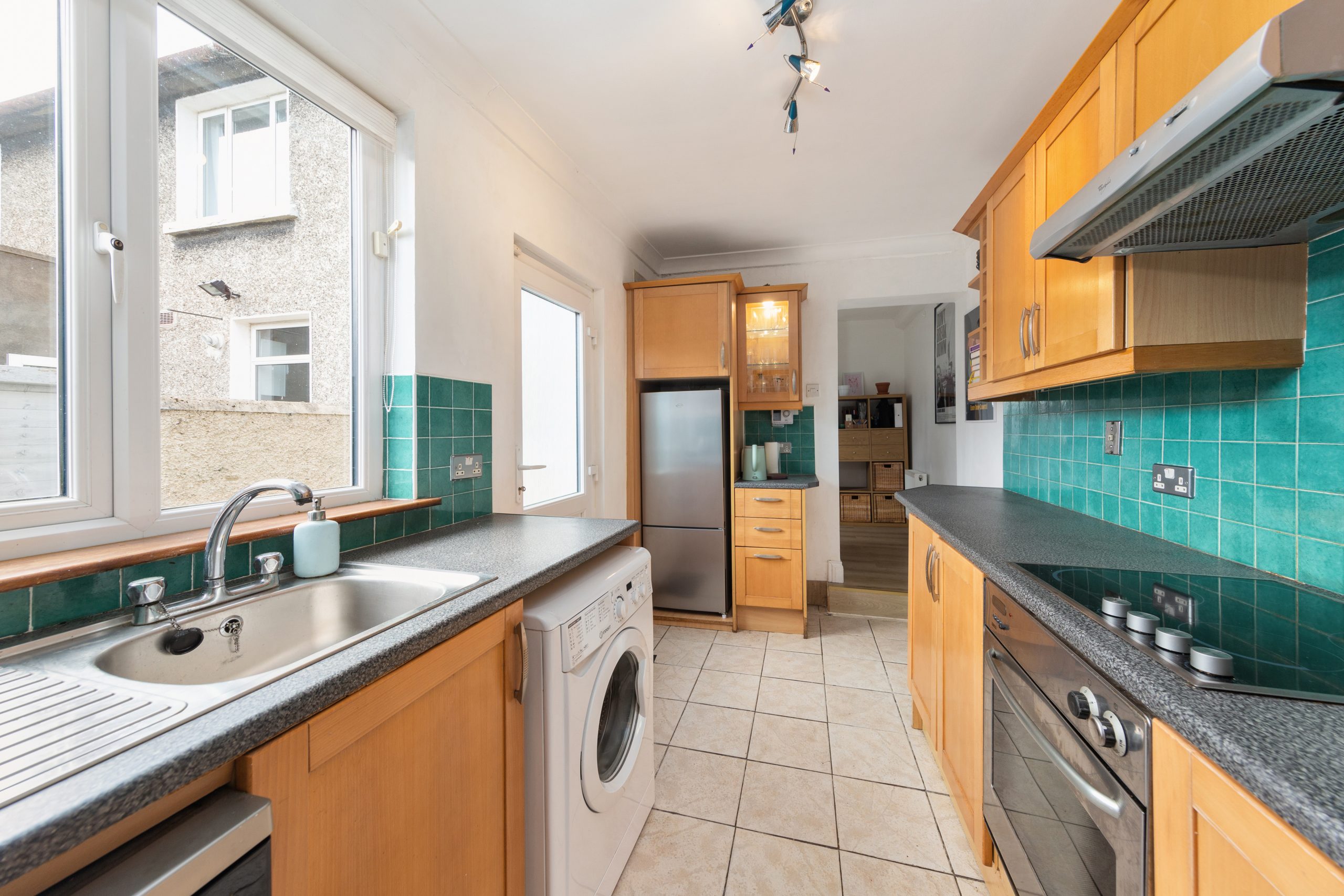 Tiled floor. Range of wall and floor units. Tiled splashback. Integrated oven, hob, extractor fan. Plumbing for washing machine. Plumbing for dishwasher.