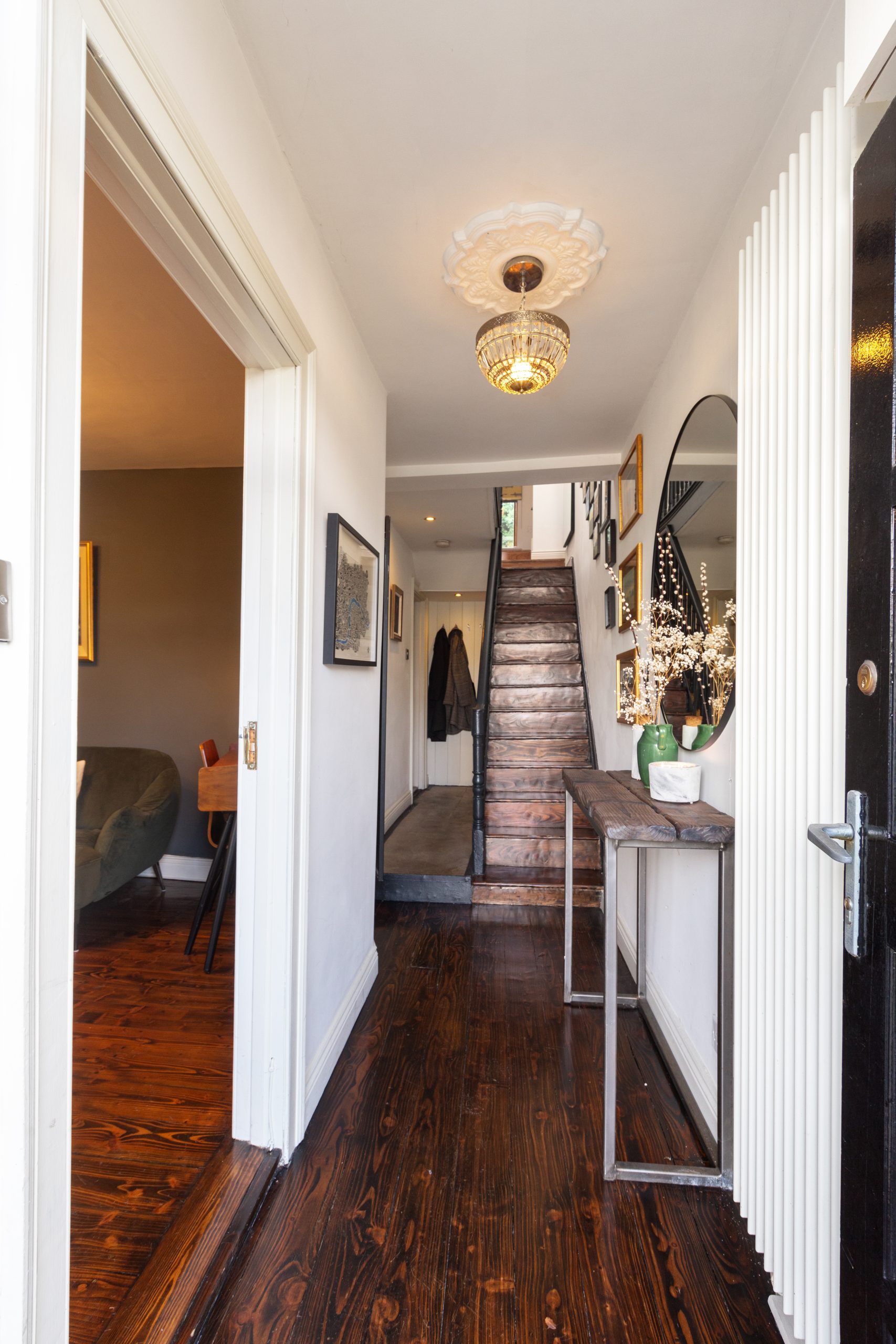Original reconditioned stained floorboards and stairway. Centre rose. Alarm panel. Understairs storage.