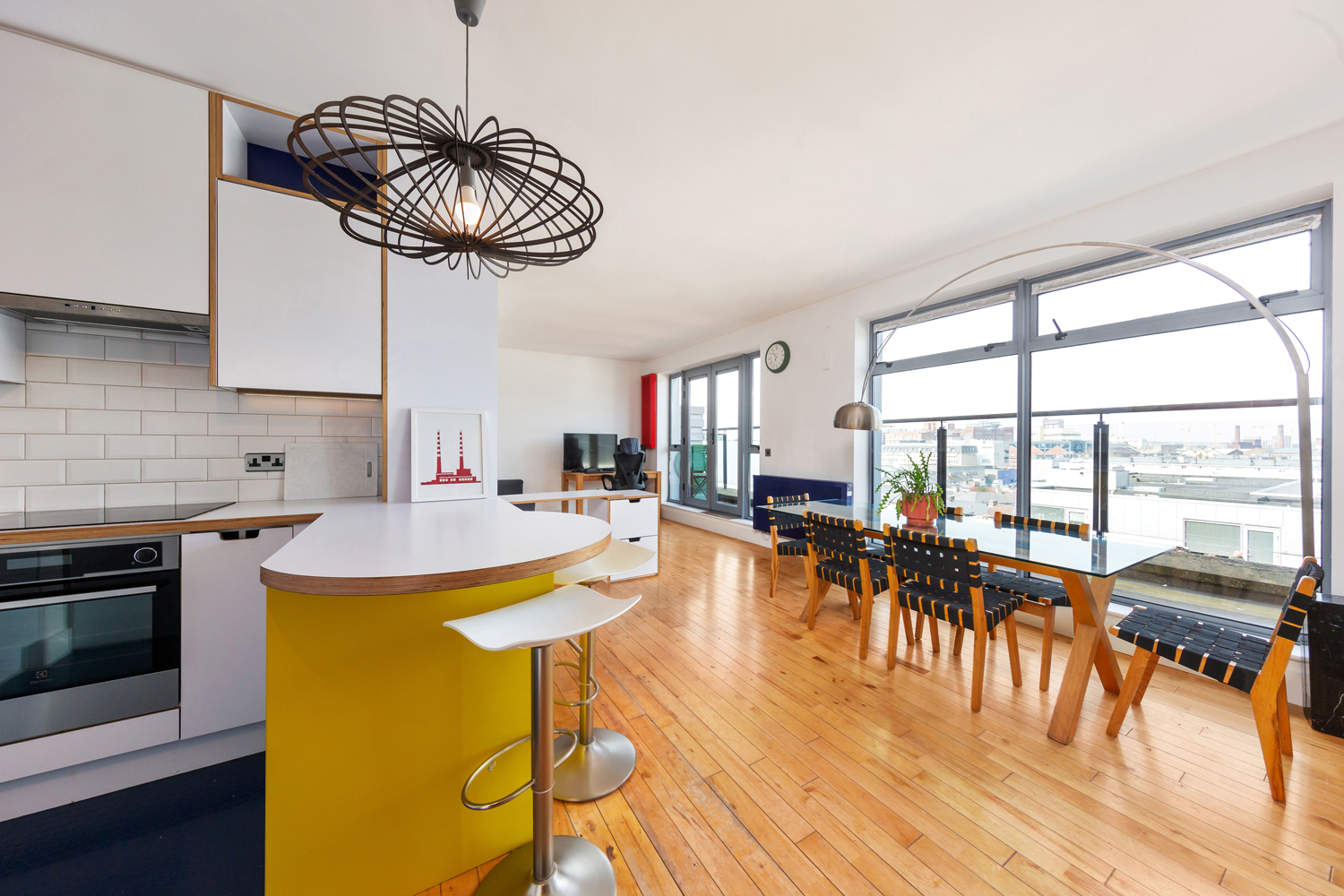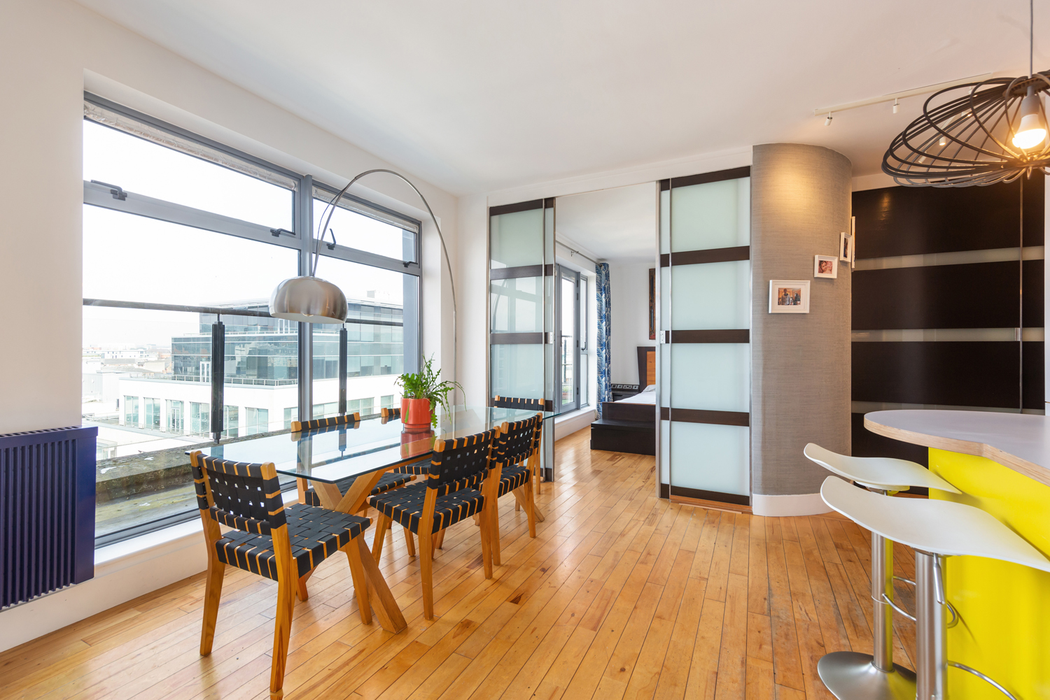 The living and dining area is flooded with natural light, enhanced by solid wood flooring throughout and a fully glazed wall that offers stunning views over Dublin.