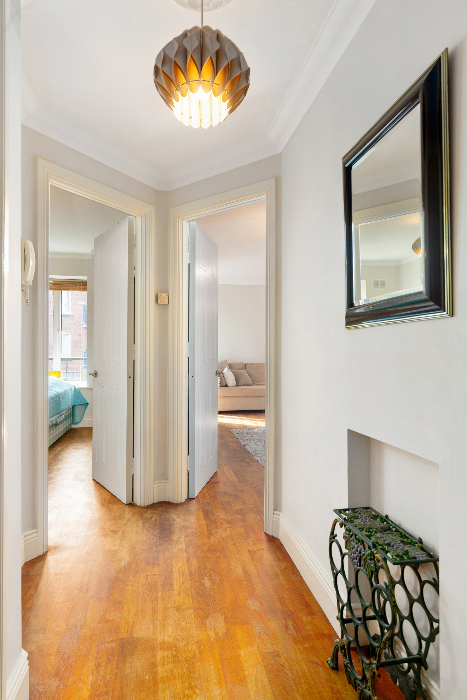 Solid oak wood floor. Cornicing. Rows. Shelfed storage. Intercom to front door.