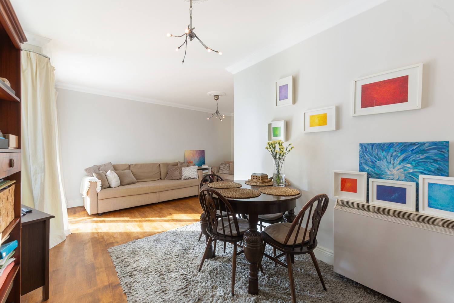 Solid wood floor. Cornicing. Rows. Door to balcony. Tv point
