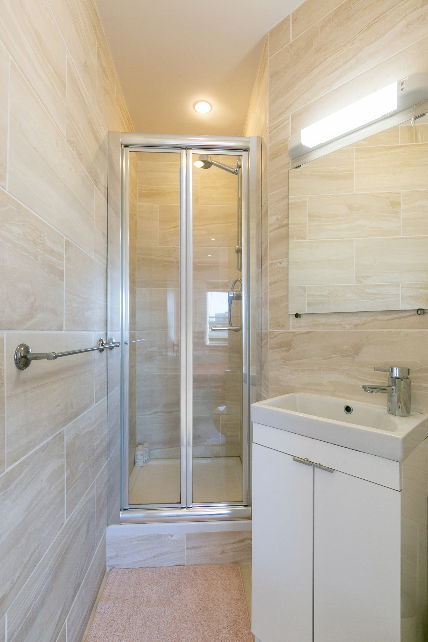 Fully tiled. Bath with shower. WC. Wash hand basin. Extractor fan